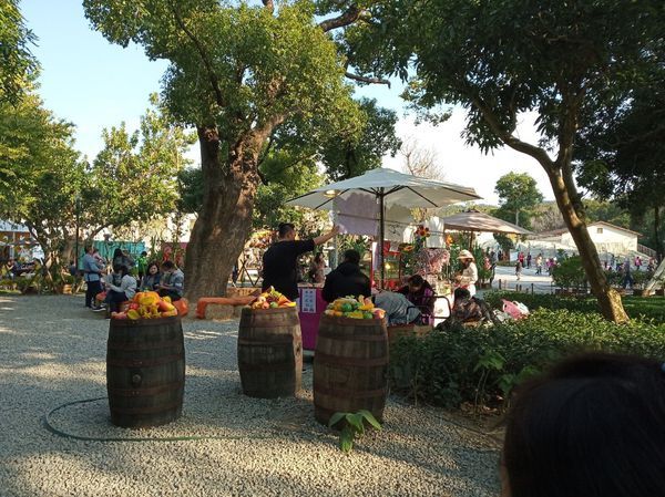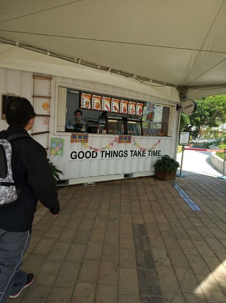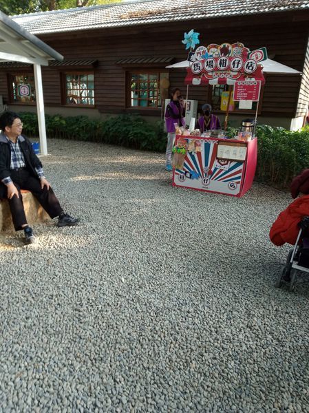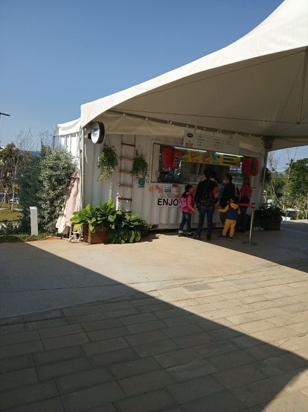 一路坐公車到來有點累,剛好入口處有可以休息的座位區,還有小吃部 我便拿出我抽到的全家福袋裡的食物,拿出來分享。