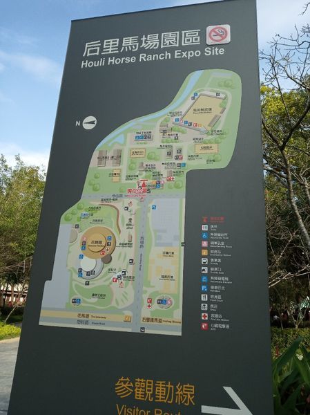 這裡便是后里馬場園區的地圖,園區分為兩部分,一邊是新蓋的花舞館,一邊是古蹟后里馬場。