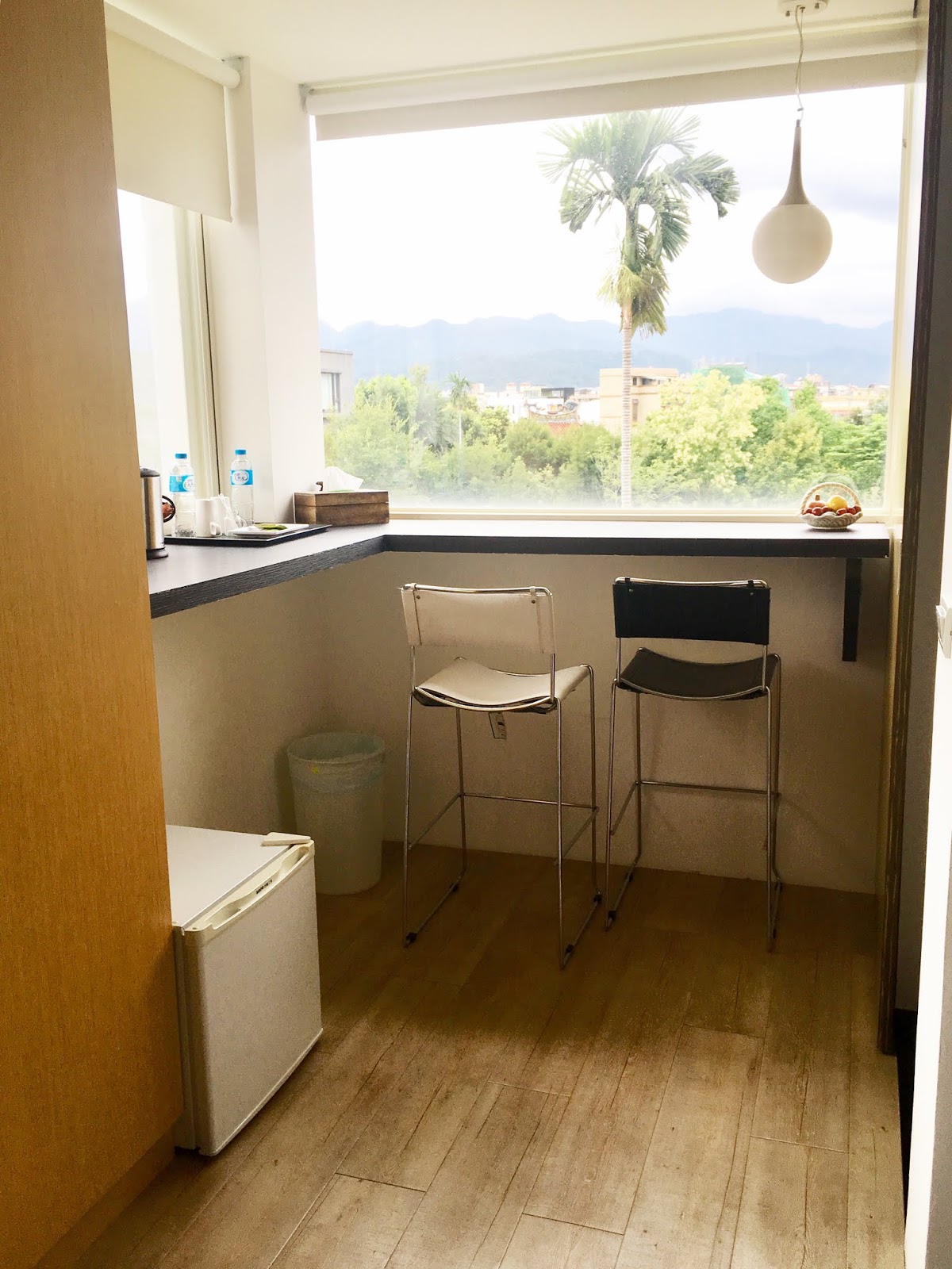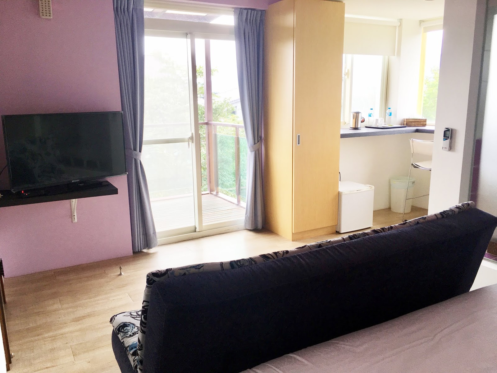 由於今晚預約的其他家庭尚未入住,老闆也讓我們參觀其他房型,和我們同樣位於三樓的「覆盆子奶酪」是莓紫色調,坐在窗邊吧台遠眺山嵐,感覺好舒暢啊,又是另一種風情的雅緻景色,難怪老闆說有些客人會一再入住搜集不同房型,每一間房型的風格都各有特色。