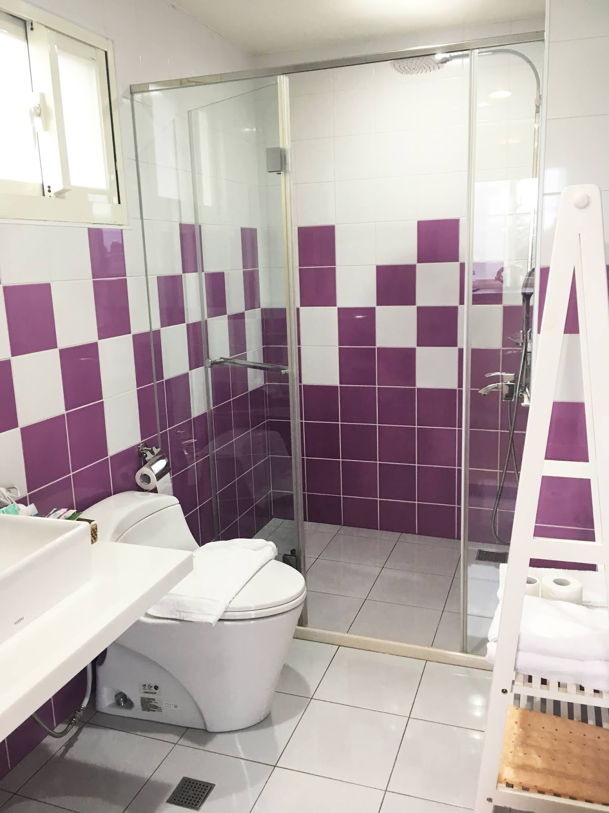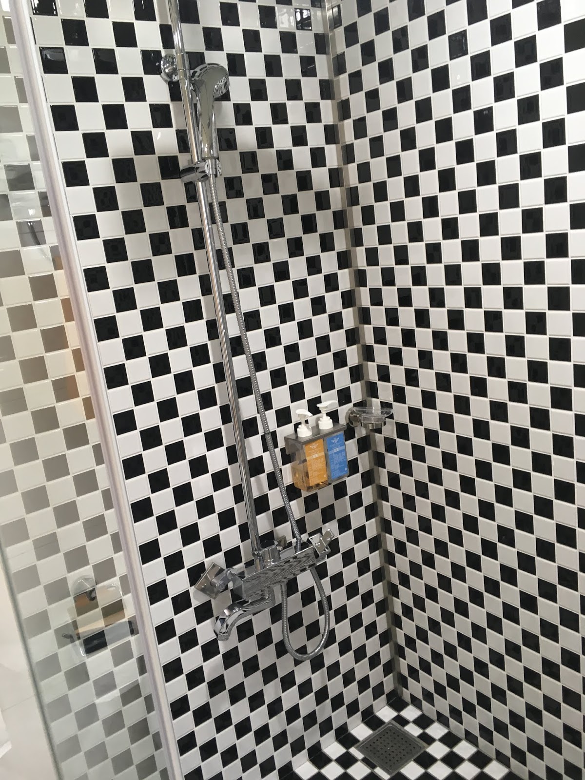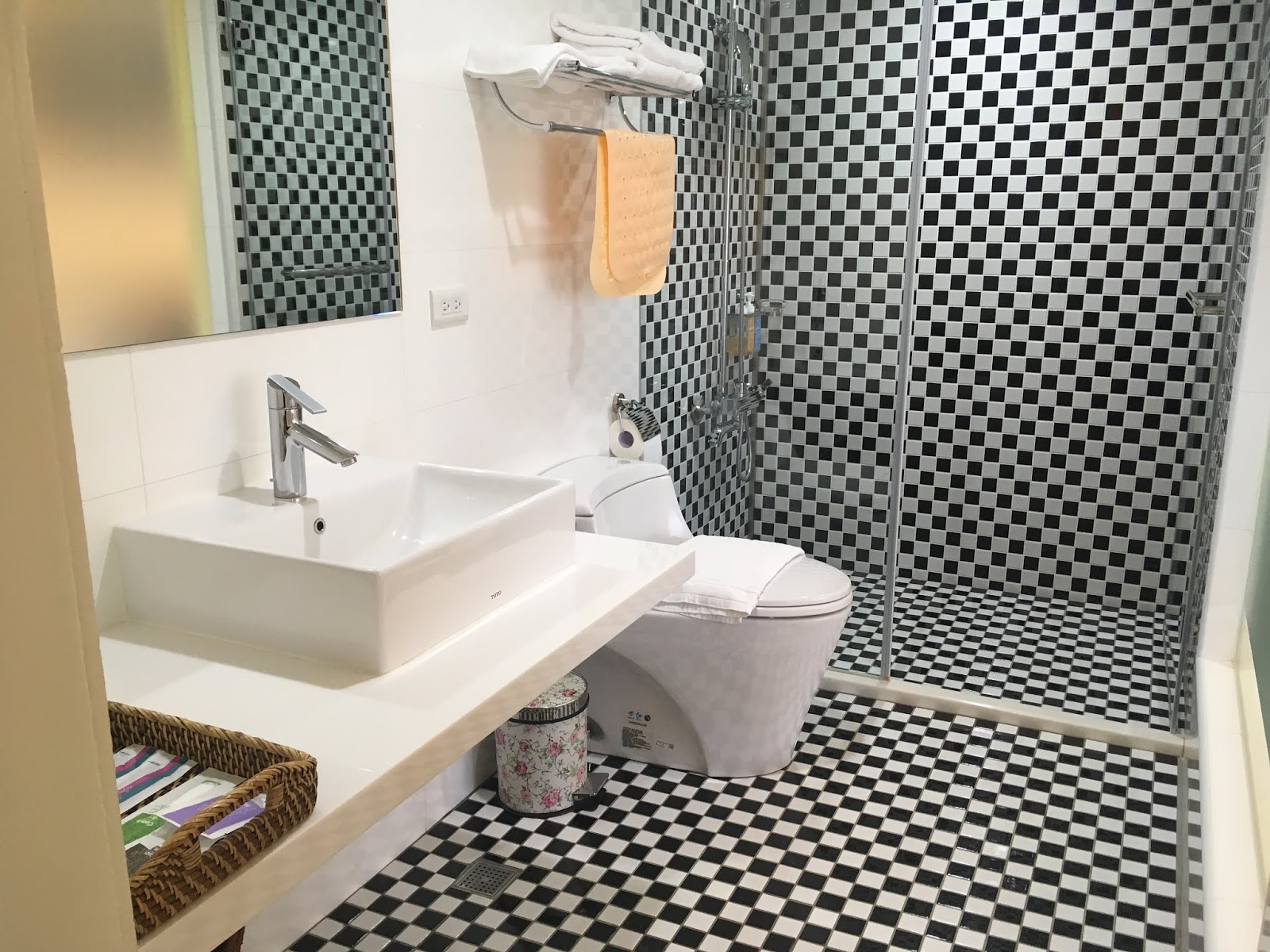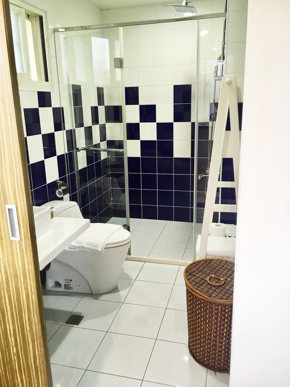 推開浴室拉門,牆壁和地板由黑白瓷磚鋪成,很有後現代的風格。浴室採乾濕分離的設計,如果有需要也可以借嬰兒澡盆幫孩子洗澡。