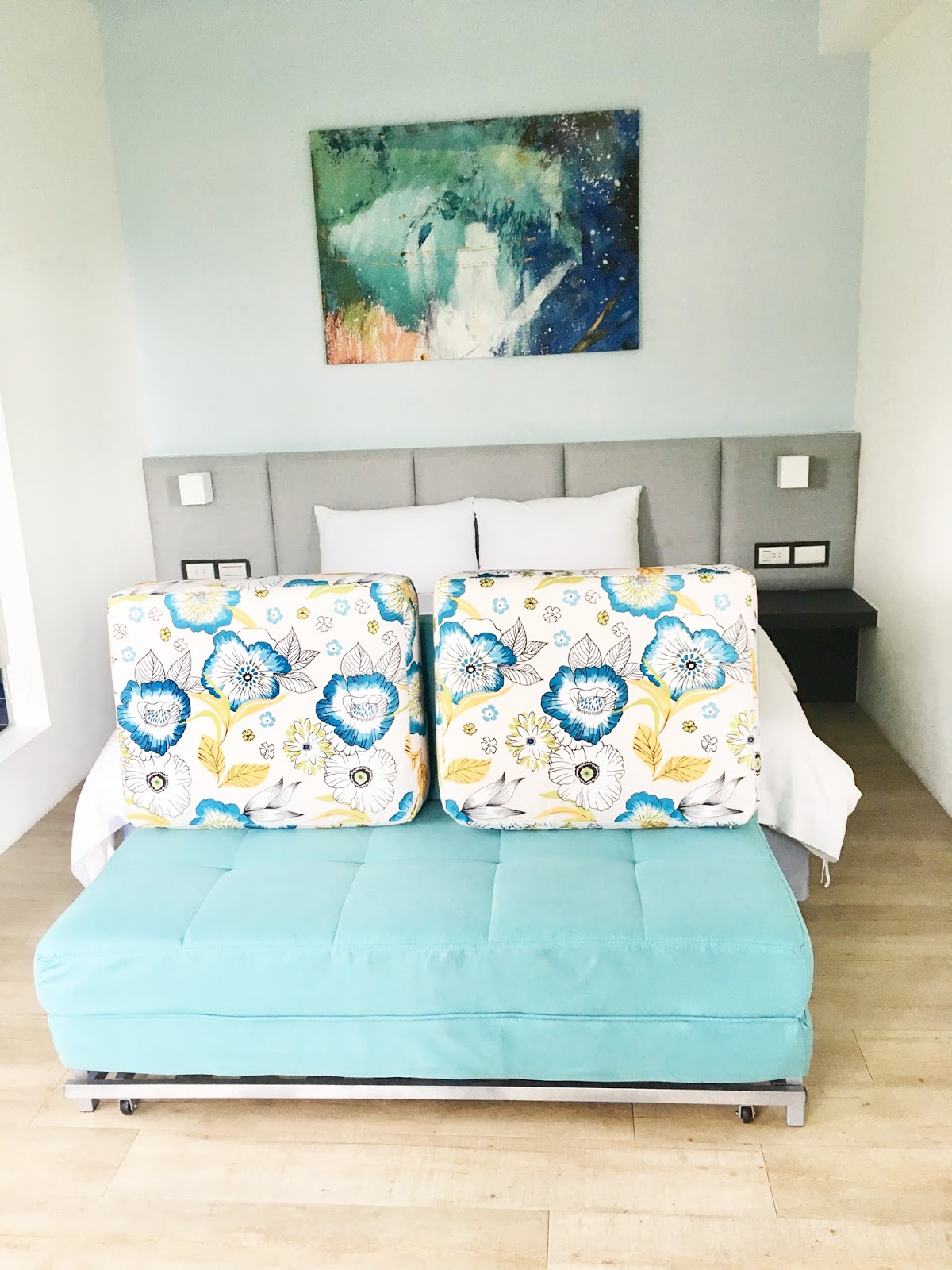 房內的Queen size加大型雙人床,躺兩個大人和一個小孩還很寬敞,而且一歲半的小福寶未滿六歲,可以免費入住還有附早餐,床前有沙發床可以再鋪床,房內空間也很足夠,孩子長大或著要加人加床也很夠住。