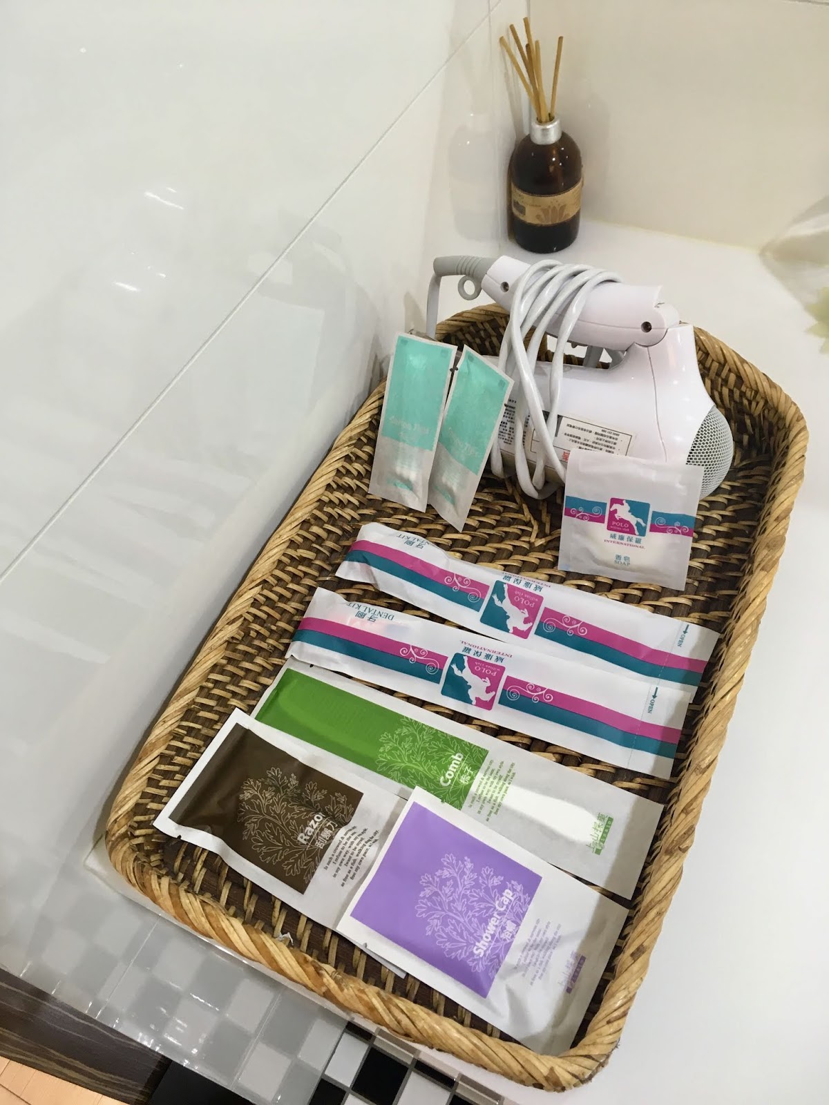 盥洗用品是上山採藥和威廉保羅,刮鬍刀、浴帽、梳子、牙刷、棉花棒、香皂都有,看到手持式的吹風機尤其開心,這樣很方便在床上幫小福寶吹乾身體了。