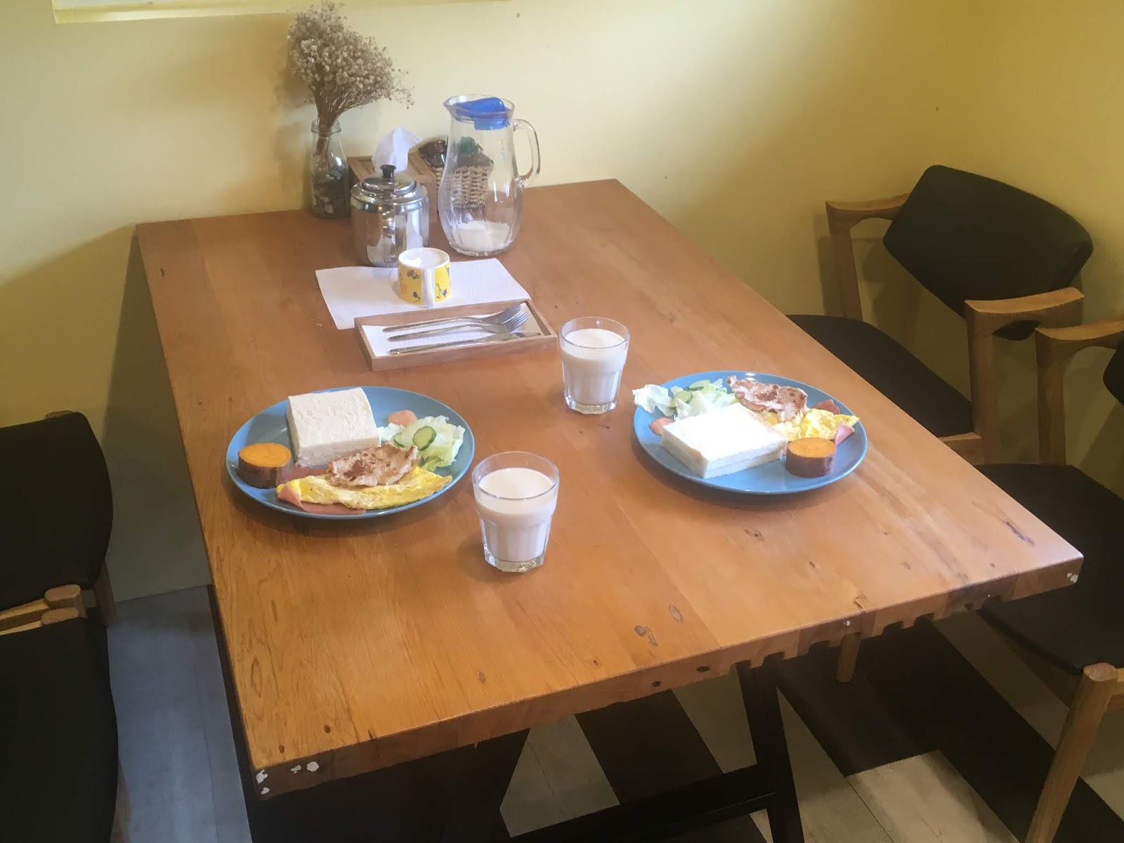 我很不好意思讓老闆癡癡地等待,趕緊入座,老闆娘幫我們兩大一小準備兩份三明治和一份兒童餐,飲料是豆漿、紅茶和咖啡。