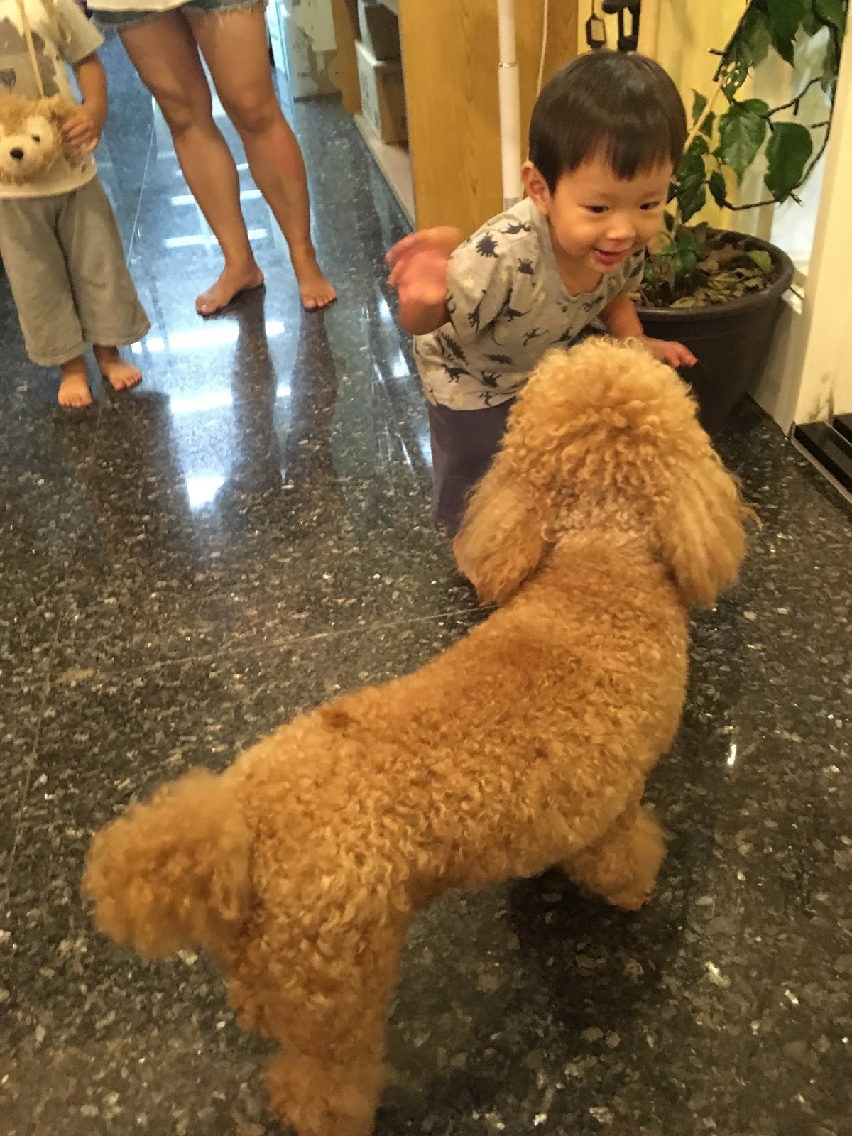 洗好的乾淨狗狗們進門了,小福寶原本有點怕狗,後來就和狗狗打成一片,在引導下可以和狗狗肥肥打招呼和摸摸頭,肥肥也很友善地回應小福寶,對第一次親近狗狗的小福寶是很好的正向經驗!