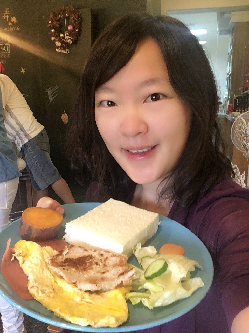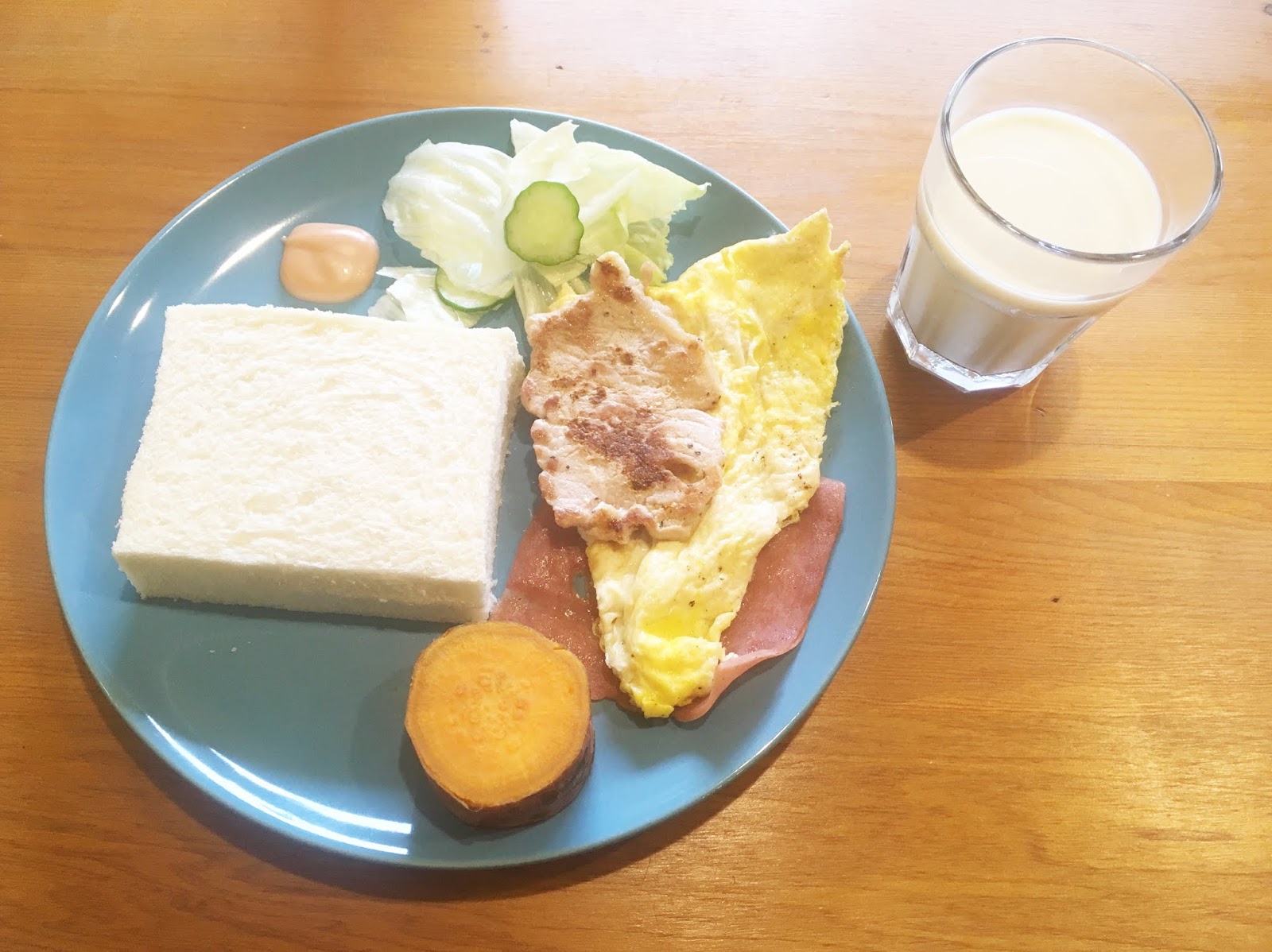 | 吐司、煎蛋、火腿、豬排、生菜、地瓜、豆漿 |