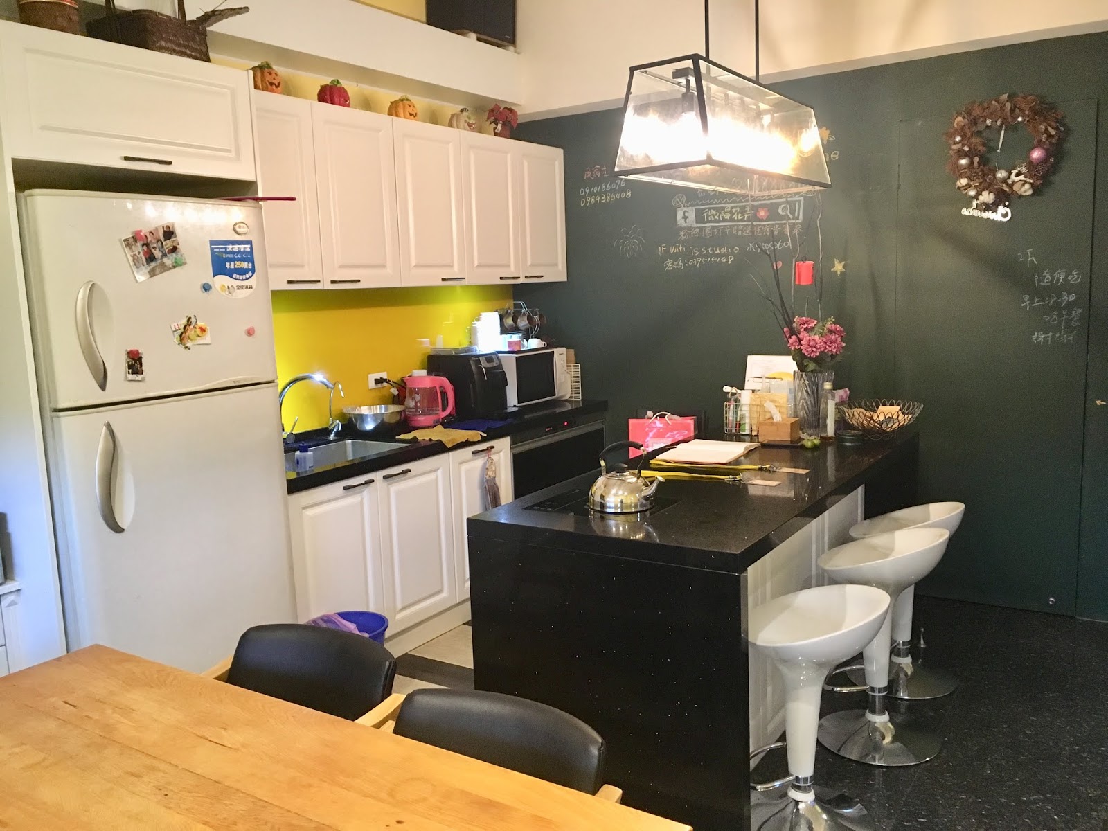 大片的黑板牆面可以讓住客書寫旅程心情,也是孩子們很喜歡塗鴉的地方,小福寶人生第一次用粉筆畫畫就在這面牆上。