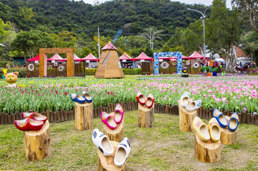 展出約7萬株、近20種花色,搭配荷蘭風車、荷蘭木鞋、巴黎鐵塔等造型裝飾,