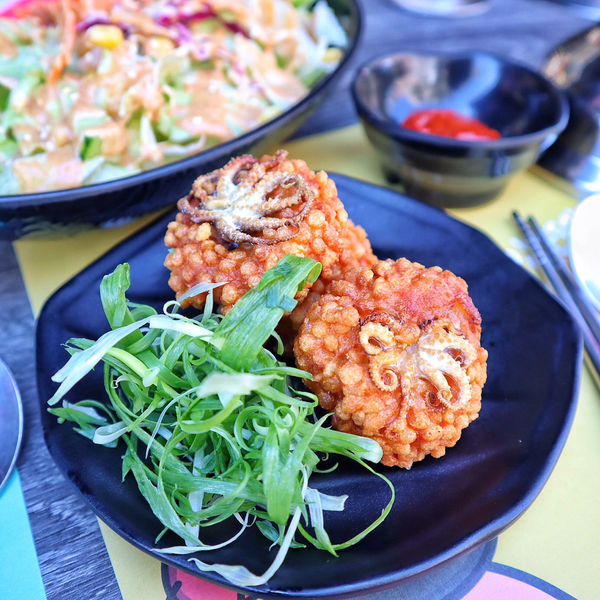 ▫️這道有點類似花枝丸,但做工更繁瑣,外頭是使用魚卵跟魚漿包覆,上頭有隻小章魚巴住開頭口後油炸到酥脆,沾取搭配的韓國辣醬夠味啊!