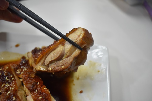 用餐心得:撲鼻而來的蜜汁香氣,讓人蠢蠢欲動,食指大開,吃下一口,雞肉肉質細嫩,雞肉比一般雞肉更有彈性,甜汁入味,越吃越想吃,越吃越有味。這種做法的蜜汁雞腿需要較長的時間,但長時間醃製,雞腿已經完全吸收醬汁裡的精華,再經過烤箱高溫烘烤把醬汁牢牢鎖在雞腿裡,烤的過程中蜜汁雞腿香氣已充滿整個廚房,讓人不由自主垂涎三尺。