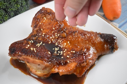 5.將醬汁倒進雞腿肉內,再撒上芝麻就大功告成。