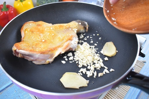 2.再加入適量的薑片-蒜末-糖-醬油-米酒,煎至雞腿皮成焦黃色