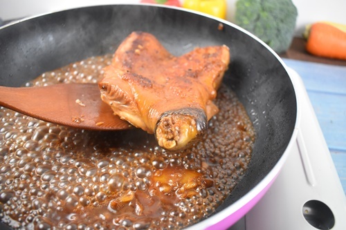 4.將鍋裡剩餘醬汁加入蜂蜜再加熱,等醬汁沸騰之後就可以了
