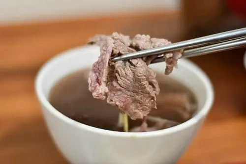 現切的溫體牛肉,每一片不大也不厚,淋上先煮好高湯.