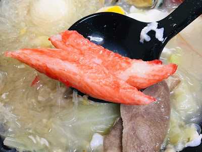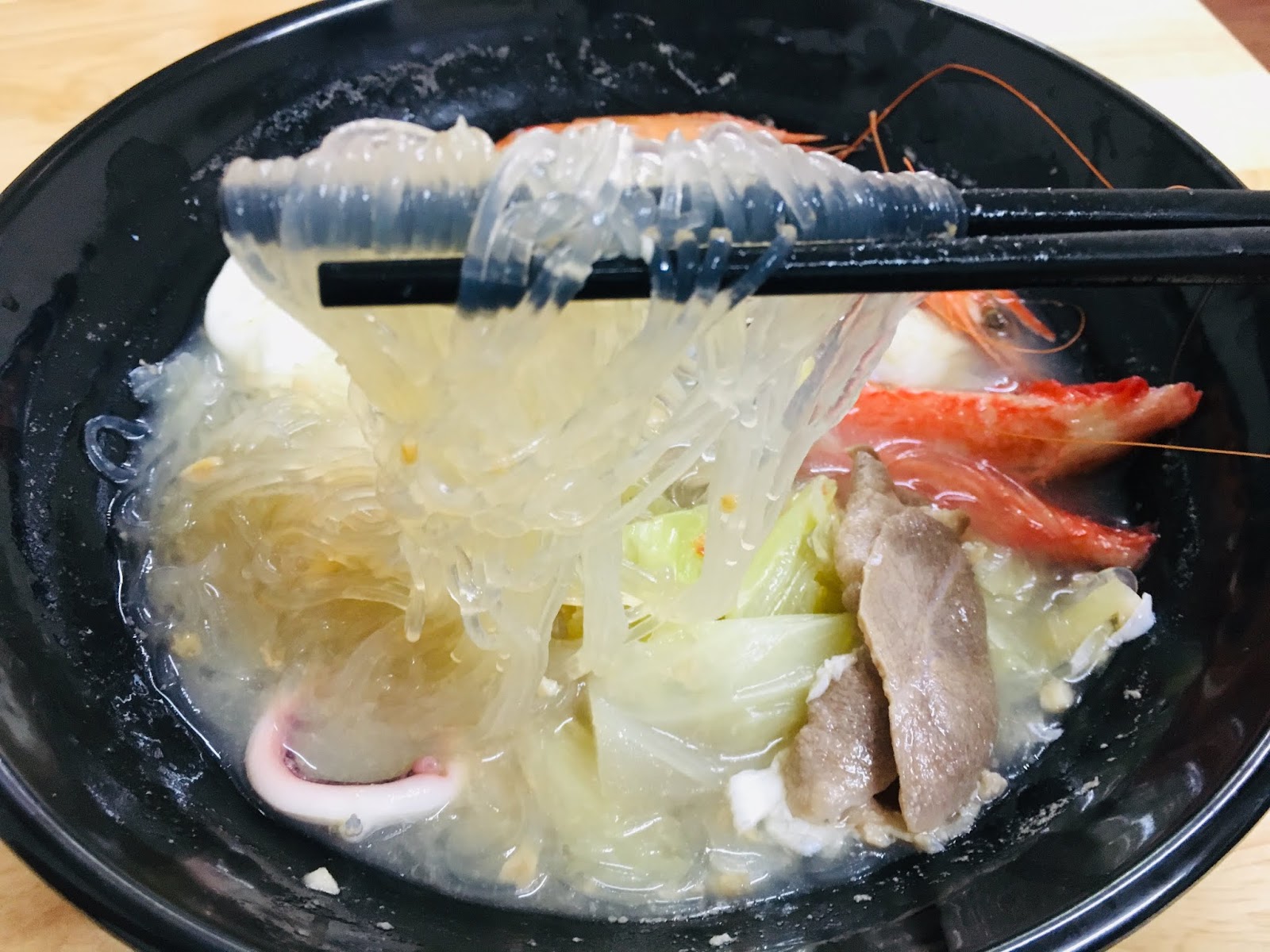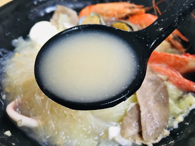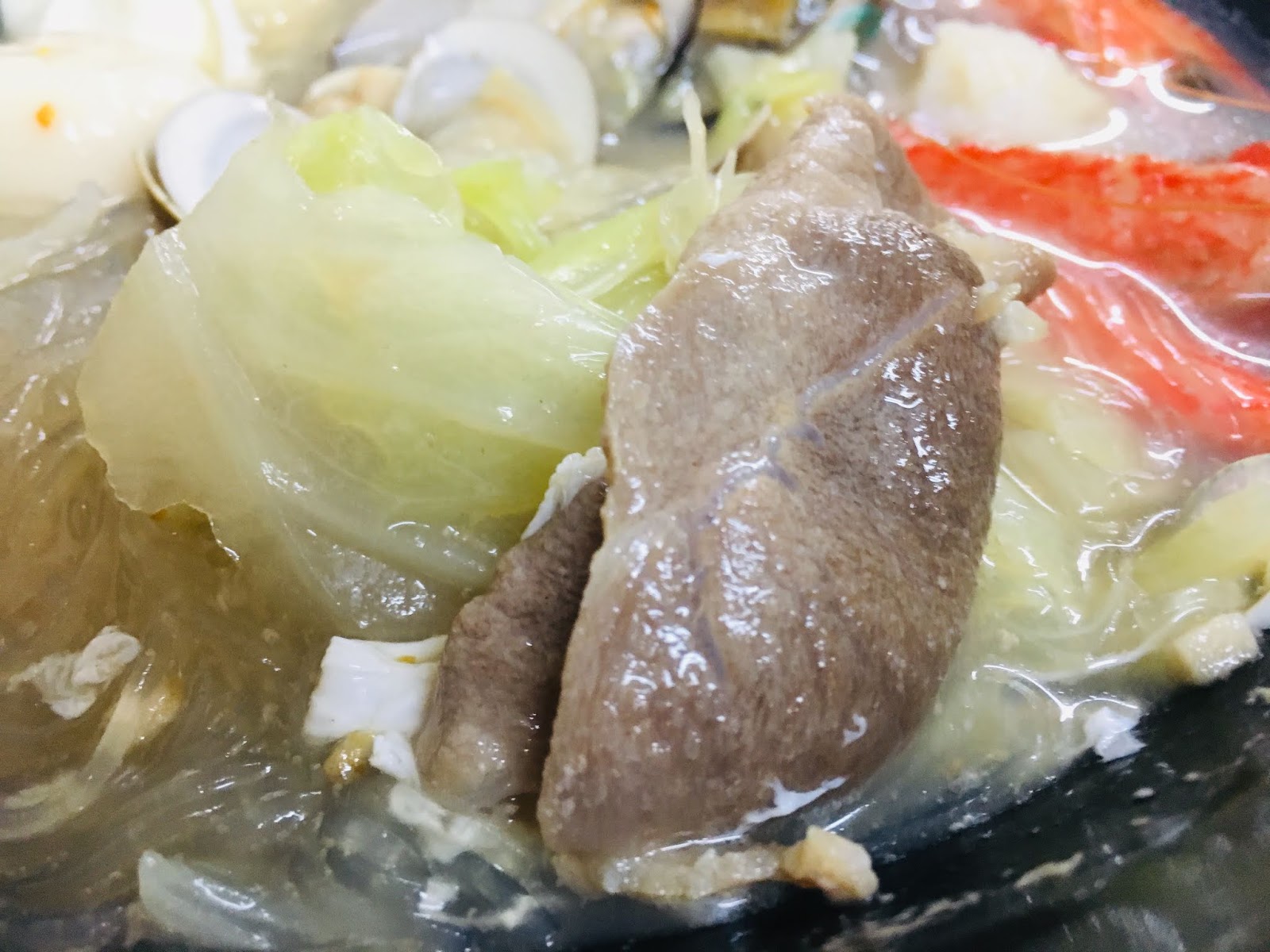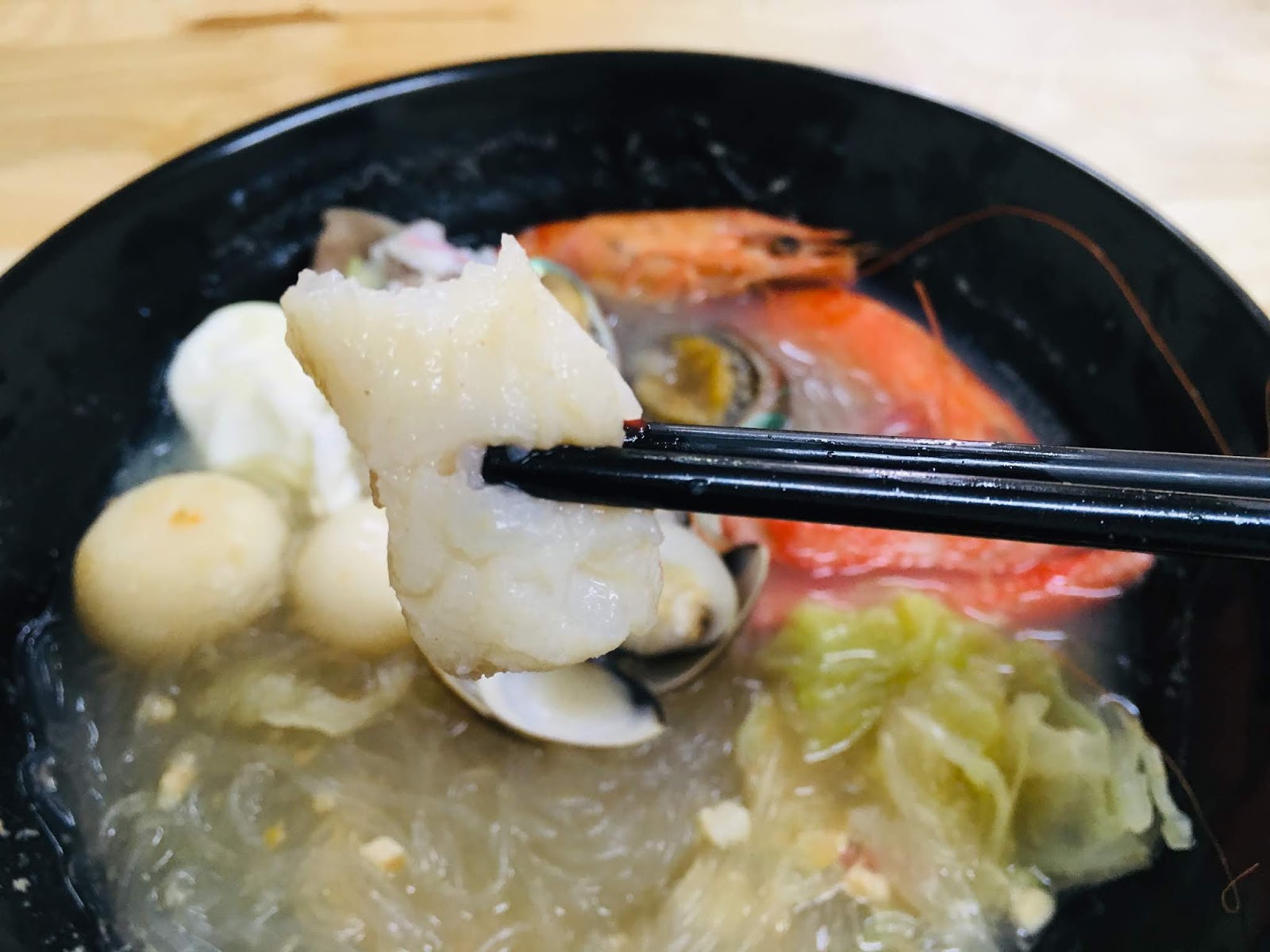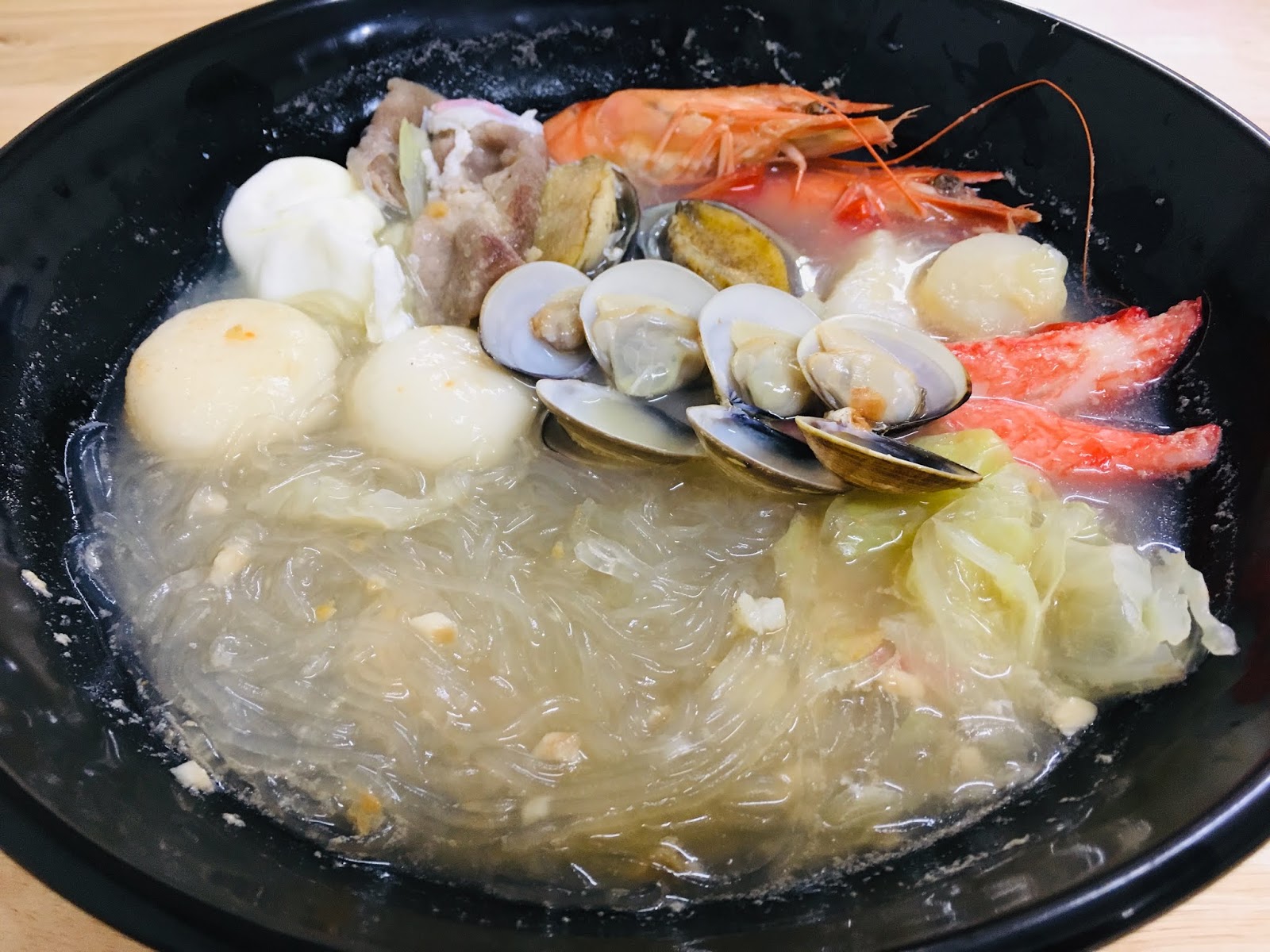 「豪華海鮮鍋燒冬粉」有許多新鮮的海產:入口彈牙的大草蝦、肉質細緻的鮑魚、飽滿軟嫩的干貝、嫩中帶脆的魷魚、滑嫩多汁的魚塊、鮮甜美味的蛤蜊、絲絲Q彈的蟹肉棒...等,還有爆漿的起司麻吉燒、嫩滑的半熟蛋包、以及營養的高麗菜和肉片來豐富多層次的口感,讓湯頭嚐起來有鮮美的海味,吸飽了海鮮精華的冬粉也入口即化,這碗「豪華海鮮鍋燒冬粉」堪稱是鍋燒界頂級的享受了!
