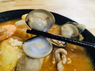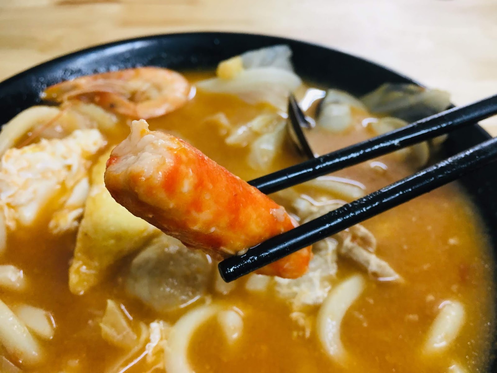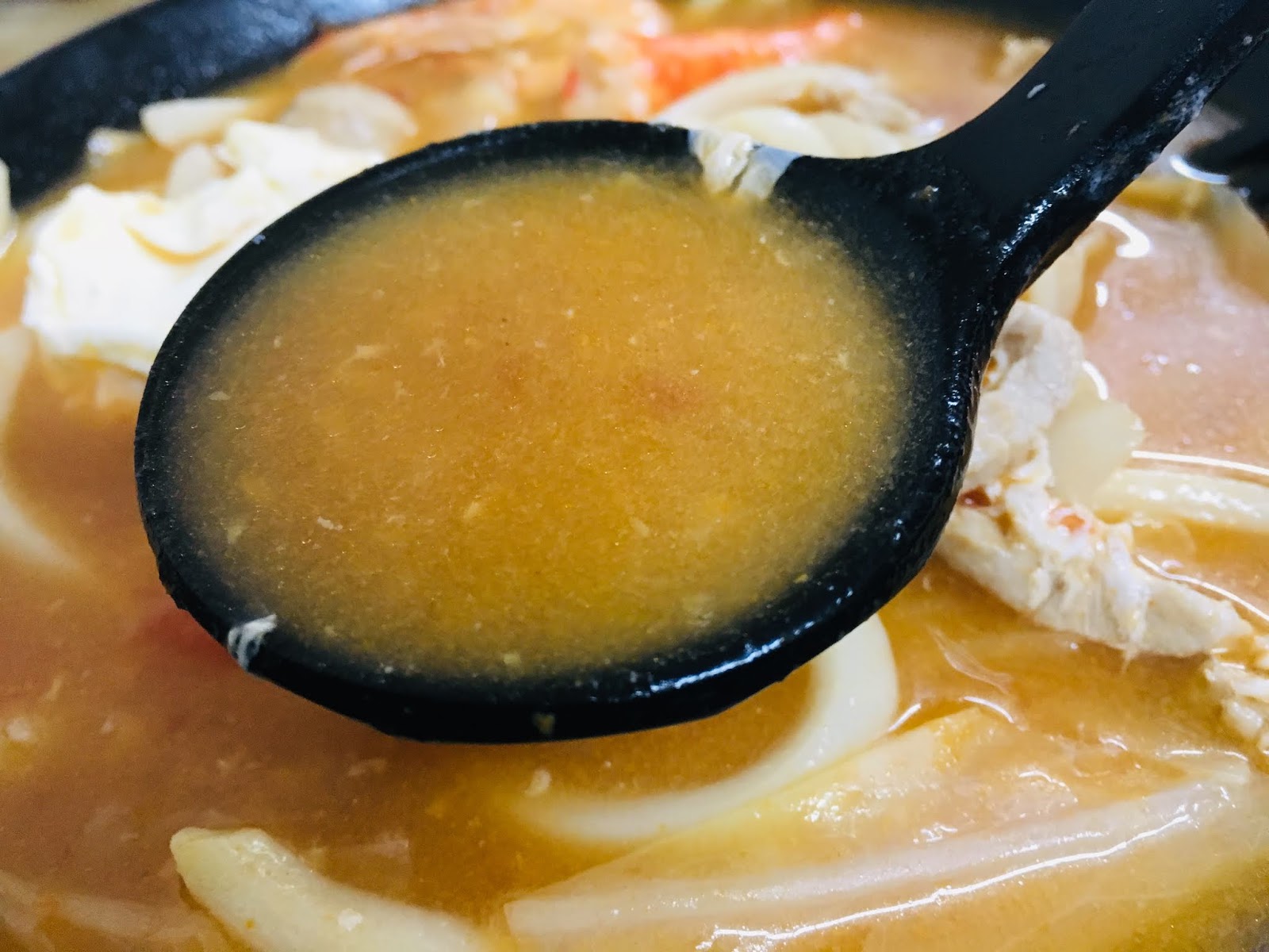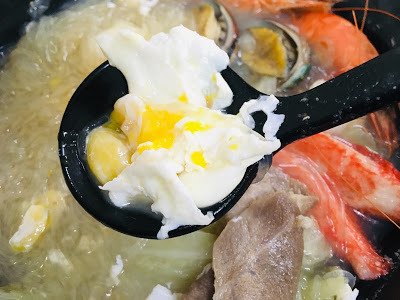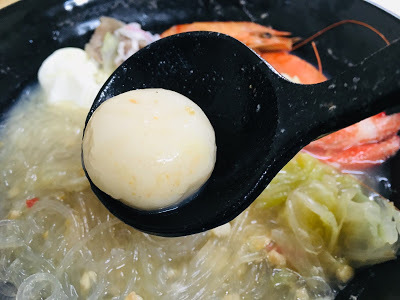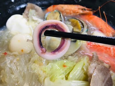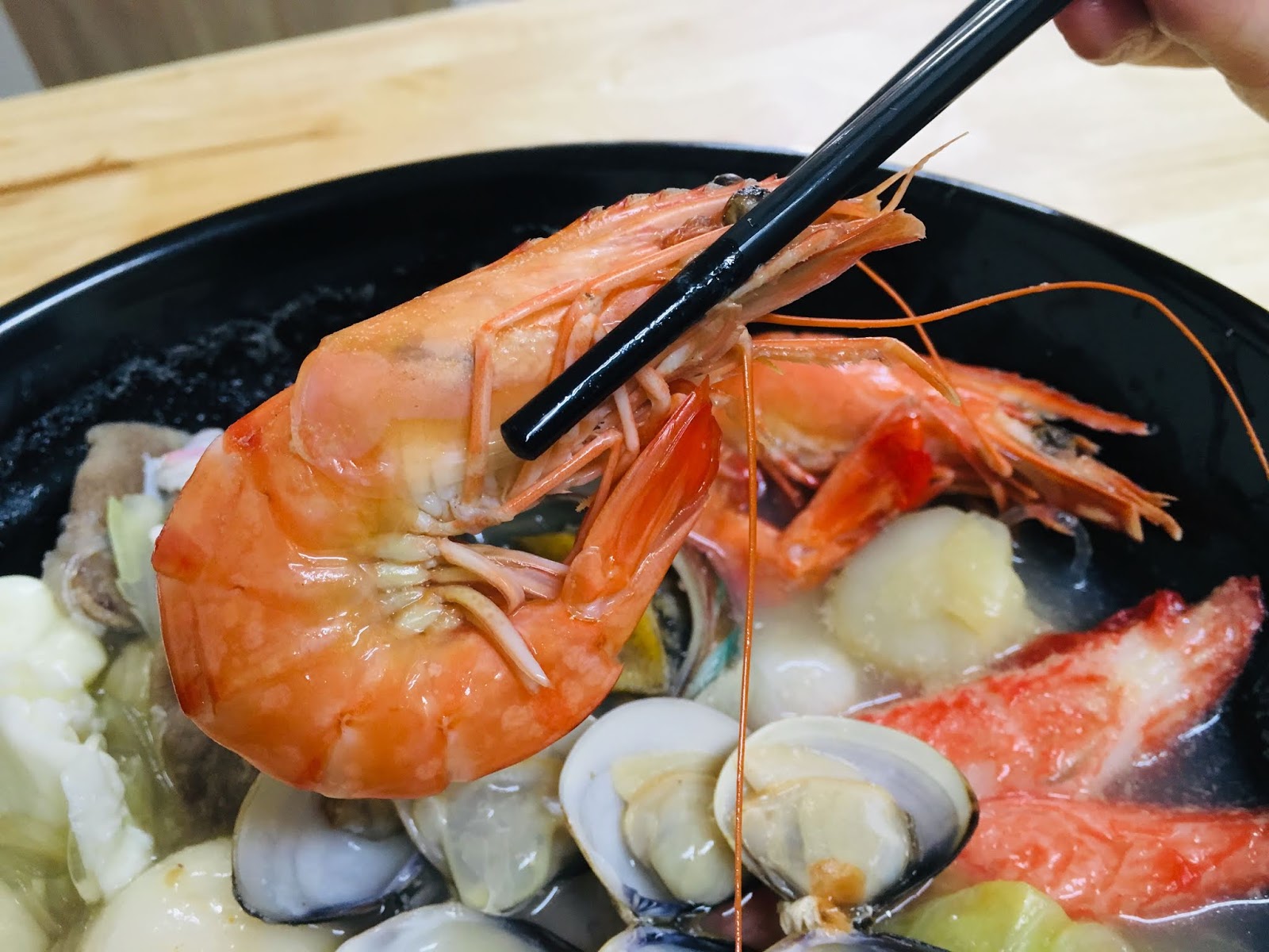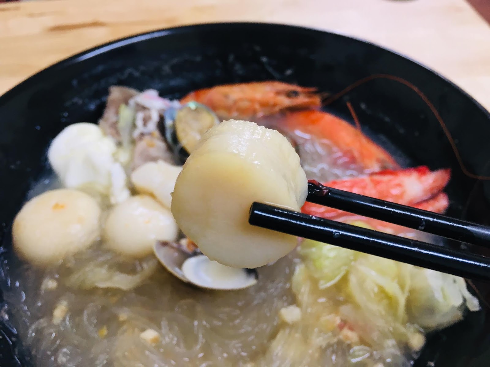 「豪華海鮮鍋燒冬粉」有許多新鮮的海產:入口彈牙的大草蝦、肉質細緻的鮑魚、飽滿軟嫩的干貝、嫩中帶脆的魷魚、滑嫩多汁的魚塊、鮮甜美味的蛤蜊、絲絲Q彈的蟹肉棒...等,還有爆漿的起司麻吉燒、嫩滑的半熟蛋包、以及營養的高麗菜和肉片來豐富多層次的口感,讓湯頭嚐起來有鮮美的海味,吸飽了海鮮精華的冬粉也入口即化,這碗「豪華海鮮鍋燒冬粉」堪稱是鍋燒界頂級的享受了!