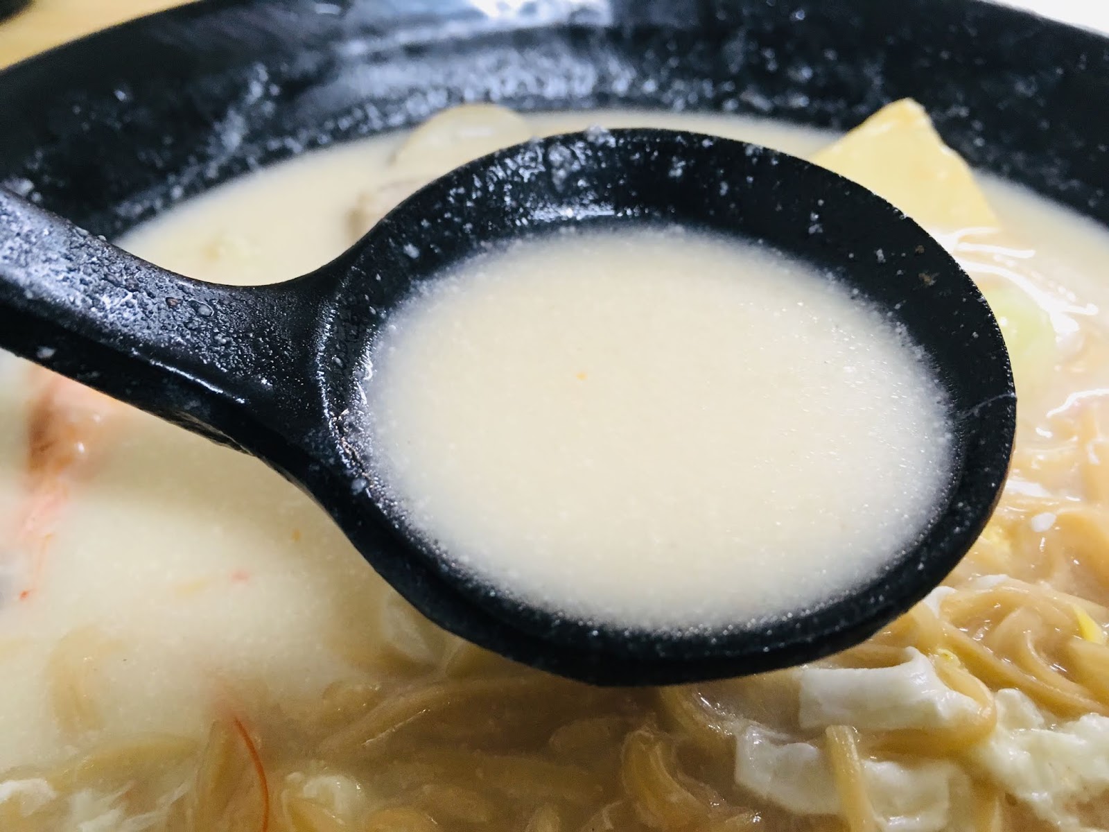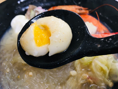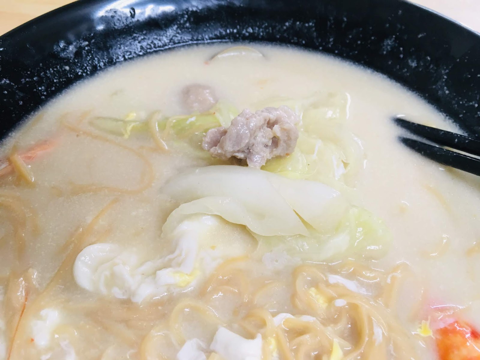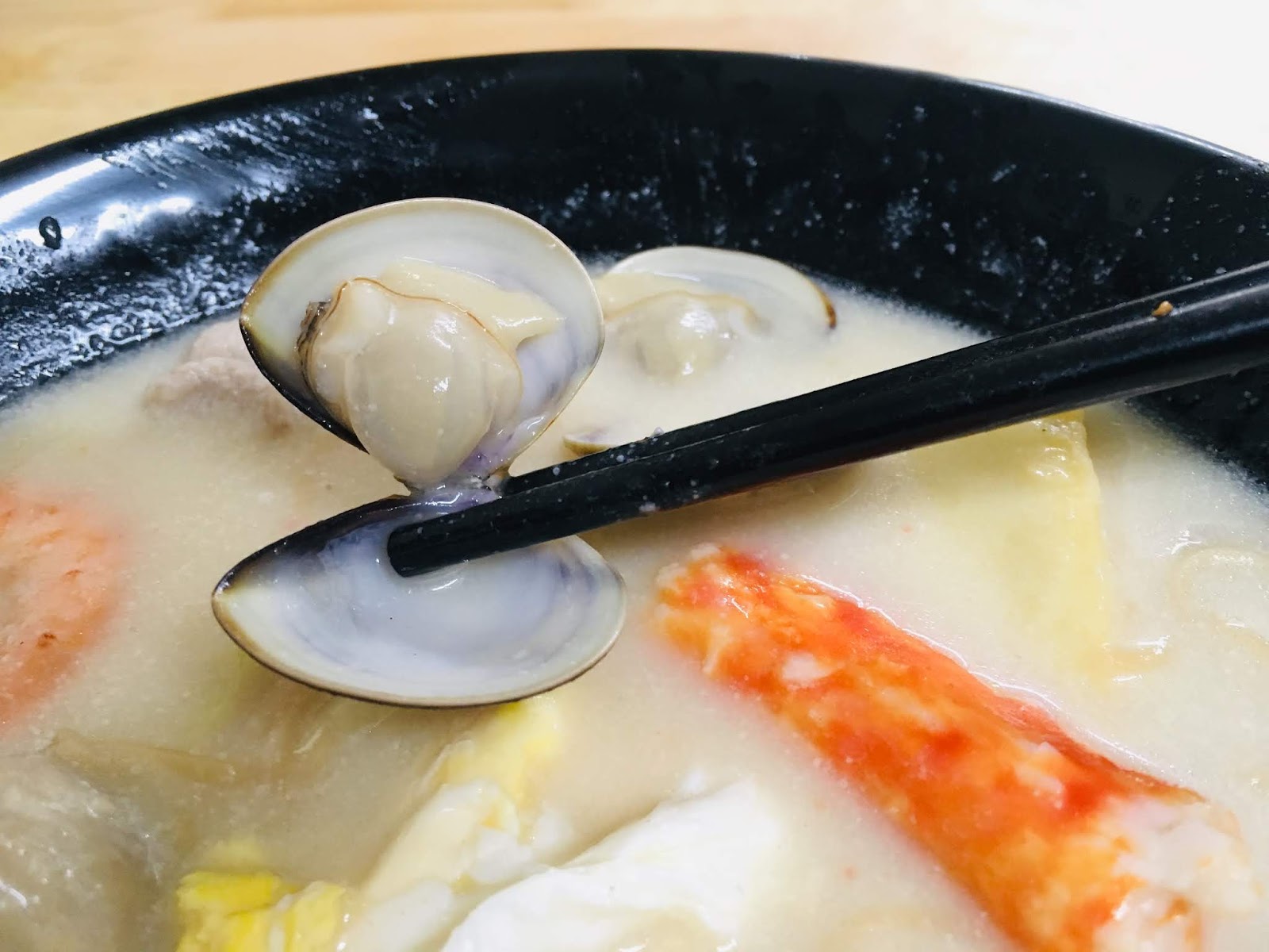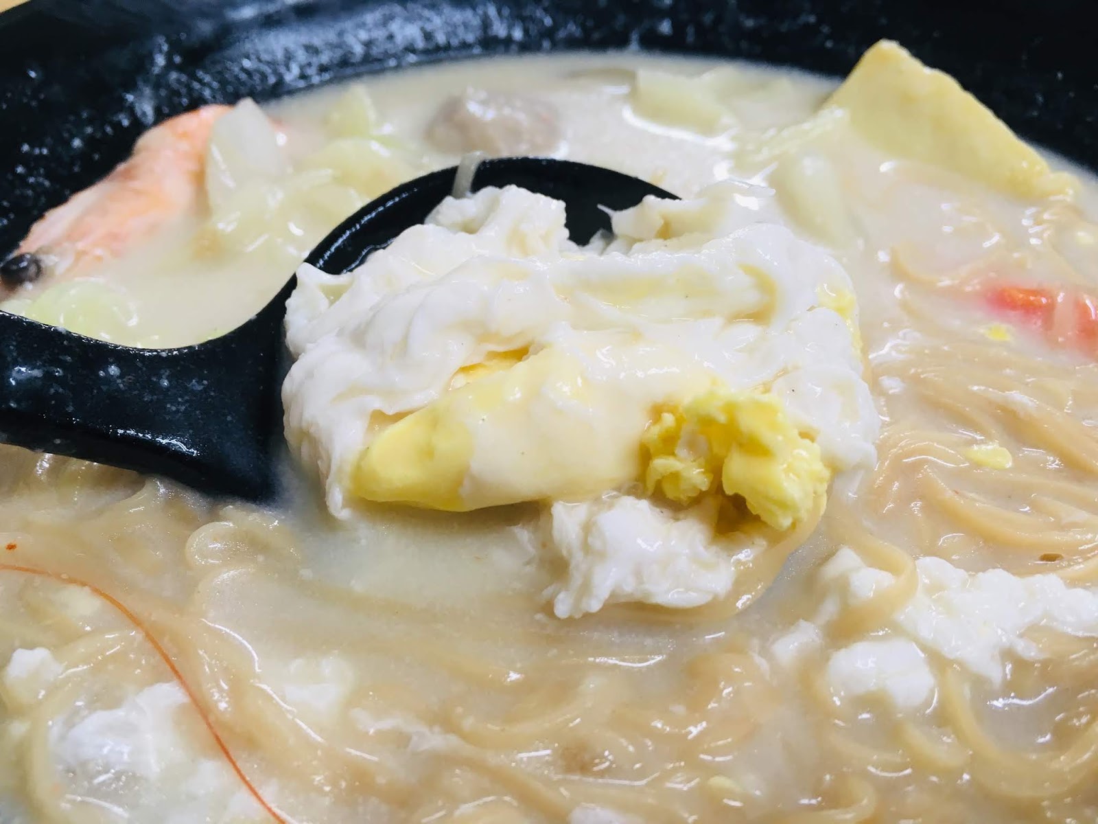 首先登場的是「牛奶鍋燒雞絲麵」,有彈性的雞絲麵吸飽了香濃的牛奶湯汁,入口後細細咀嚼,包裹奶香的細麵香醇迷人,配上有鮮甜海味的蝦子和蛤蜊、扎實有勁的貢丸、櫻花蝦卵和三角豆腐、軟嫩的半熟蛋包,並以高麗菜和肉絲兼顧營養,這一大碗「牛奶鍋燒雞絲麵」好豐盛!平實的價格卻有著牛奶火鍋的口感,很划算哪。