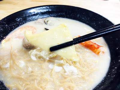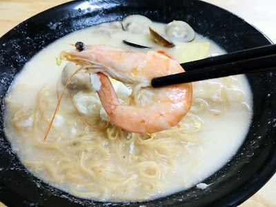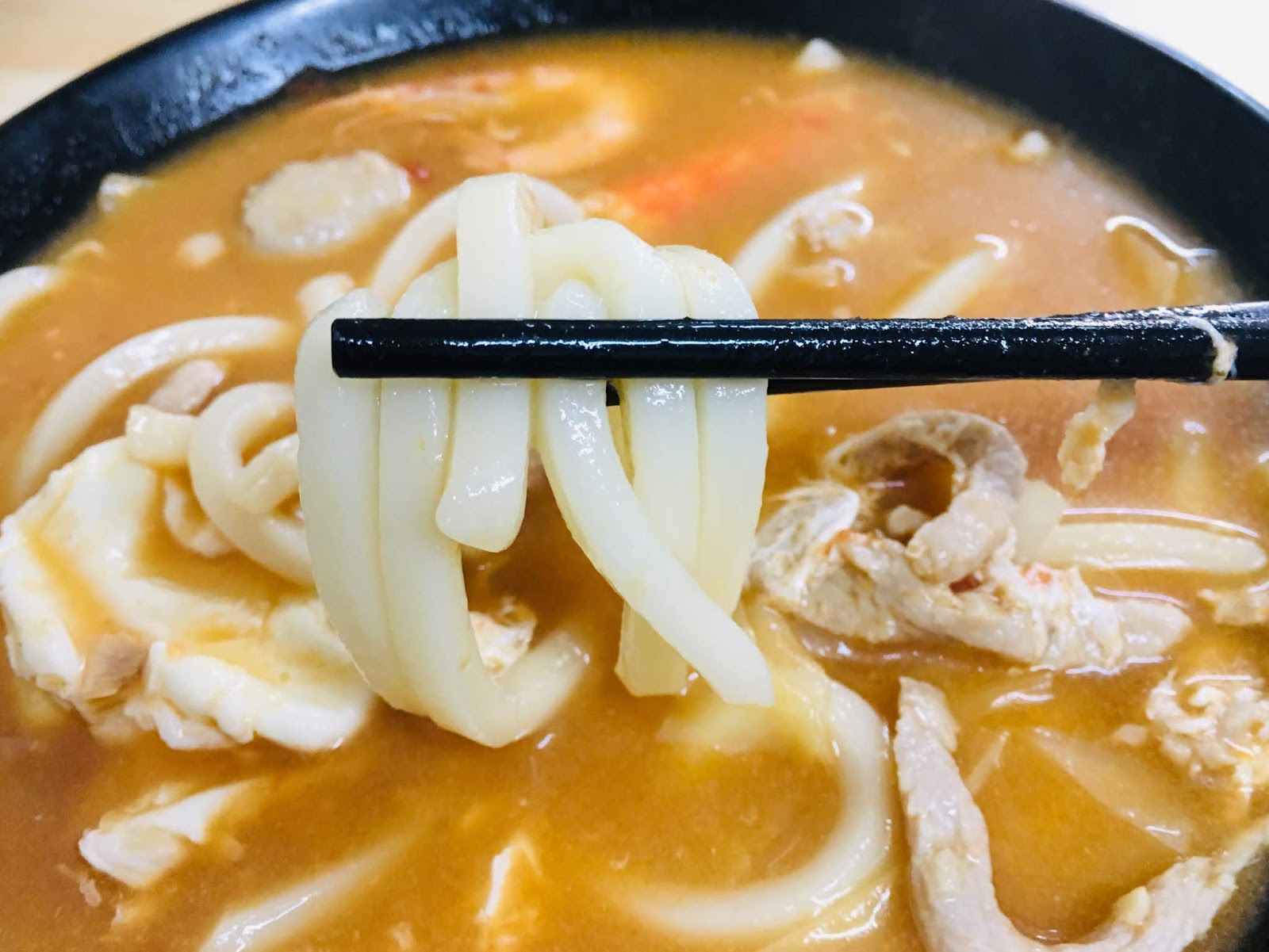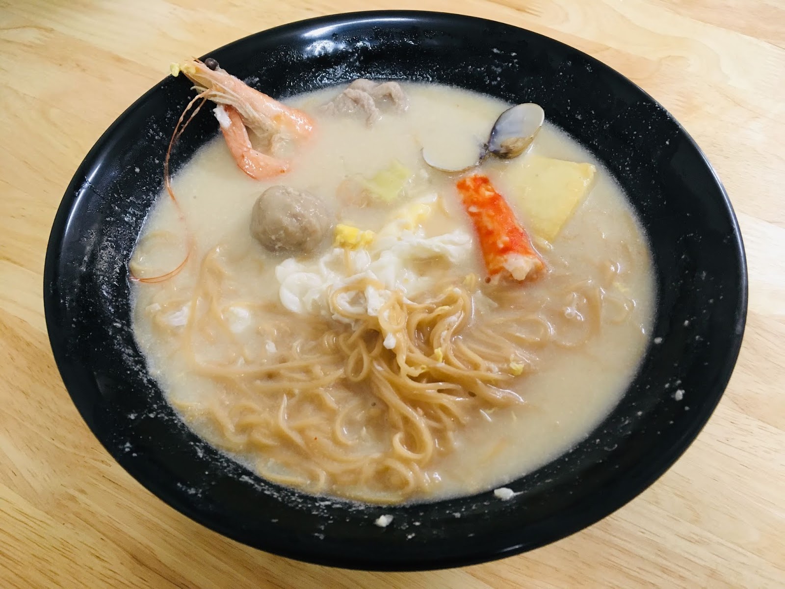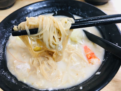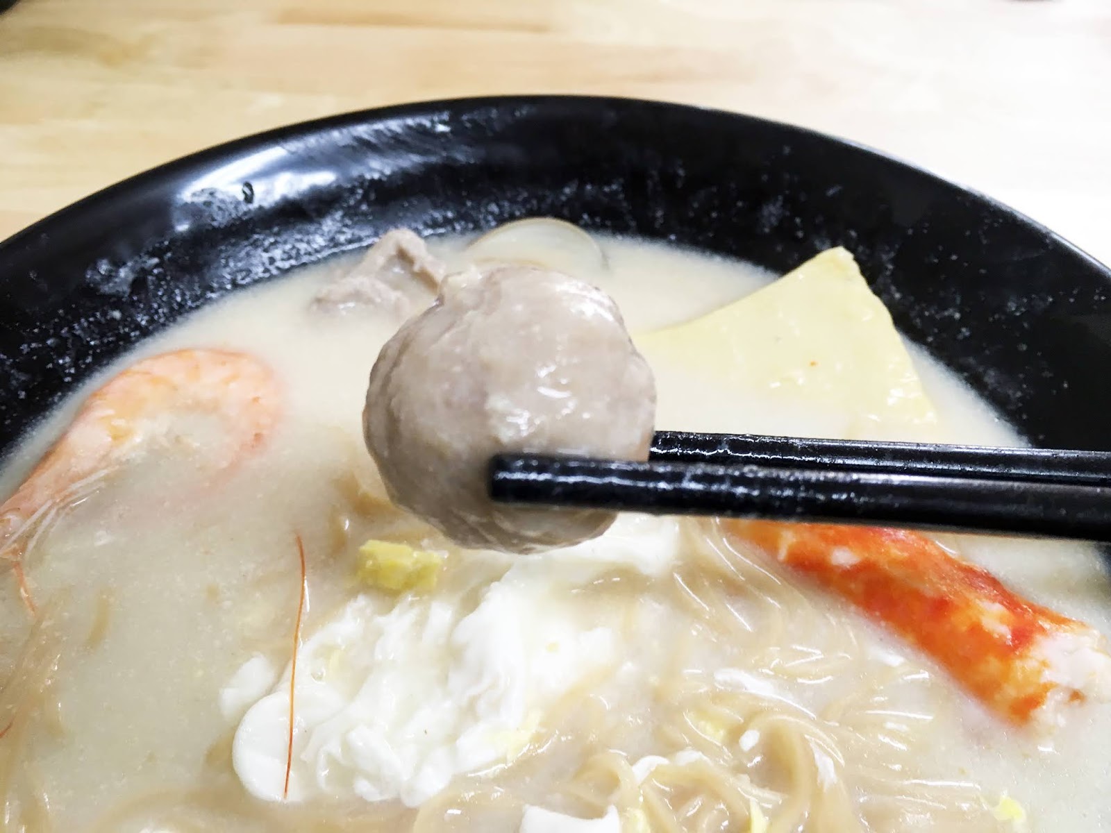 首先登場的是「牛奶鍋燒雞絲麵」,有彈性的雞絲麵吸飽了香濃的牛奶湯汁,入口後細細咀嚼,包裹奶香的細麵香醇迷人,配上有鮮甜海味的蝦子和蛤蜊、扎實有勁的貢丸、櫻花蝦卵和三角豆腐、軟嫩的半熟蛋包,並以高麗菜和肉絲兼顧營養,這一大碗「牛奶鍋燒雞絲麵」好豐盛!平實的價格卻有著牛奶火鍋的口感,很划算哪。