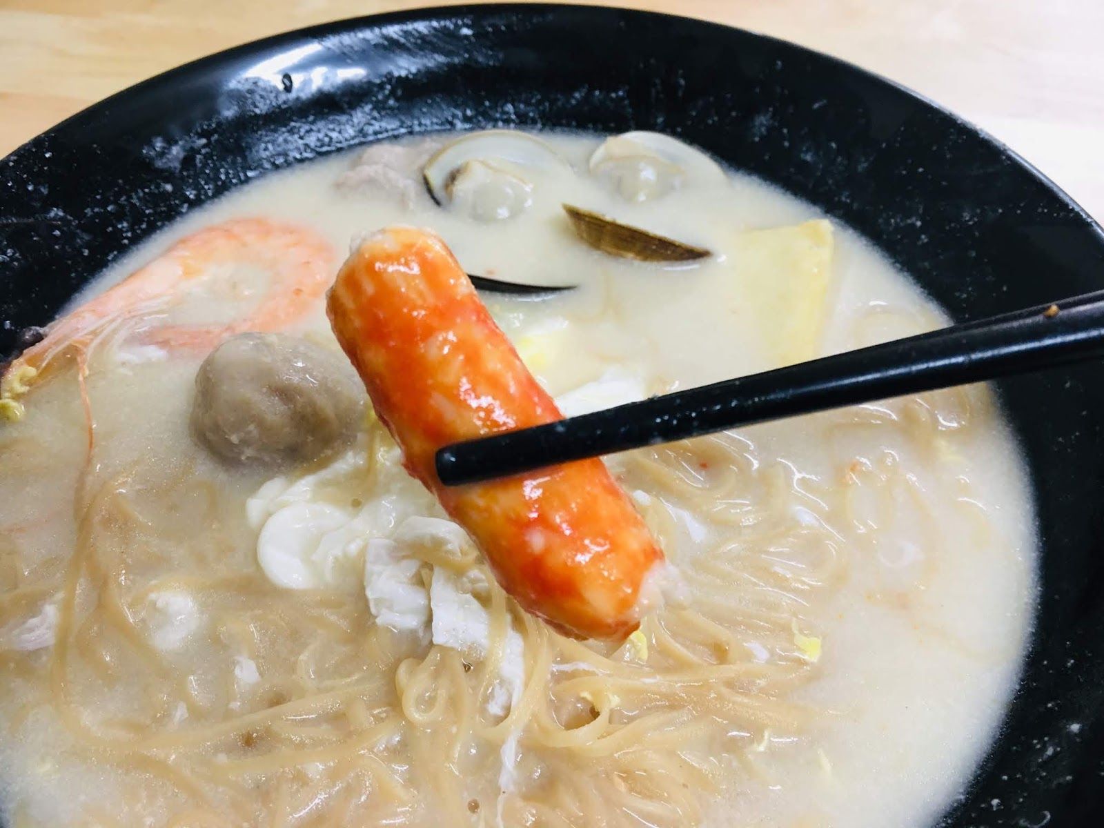 老闆娘推薦我們「牛奶」、「蕃茄」、「豪華海鮮鍋」這三種自然清甜的湯頭,基底都是每天使用新鮮蔬果下去熬煮,有洋蔥香氣和紅蘿蔔甜味,可以安心地給小孩喝。由於我們上週才吃過劉妹扎實的「意麵」,這次想試試「雞絲麵」、「烏龍麵」和「冬粉」。