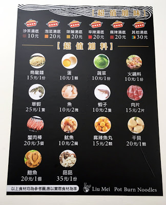 菜單上都是和總店相同的經典口味,如:原味、沙茶、泡菜、咖哩、蕃茄、牛奶、味增、海鮮、辛辣、麻辣、泰式酸辣、輕蔬菇菇、青醬、藥膳菇菇、味增龍蝦鍋、豪華海鮮鍋、海產粥、咖哩飯...等,其實原本的份量已經算大了,如果有需要還可以銅板價加購湯頭、麵和配料,在100元以內就可以吃得很飽。