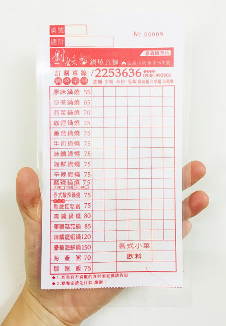 「劉妹鍋燒專賣店」源自台南歸仁每天賣三、四百碗鍋燒意麵的熱門店家,以新鮮蔬果熬煮湯頭,讓大人、小孩都可以吃出健康,還有原味、沙茶、泡菜、咖哩、蕃茄、牛奶、味增、海鮮、辛辣、麻辣、泰式酸辣、青醬、藥膳...等豐富口味。最近開放加盟後,台南、高雄突然如雨後春筍出現許多加盟店,最遠還有開到台中、屏東,我們今天來的就是嘉義開的第一間加盟店。