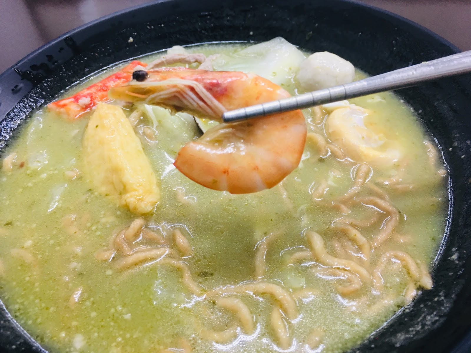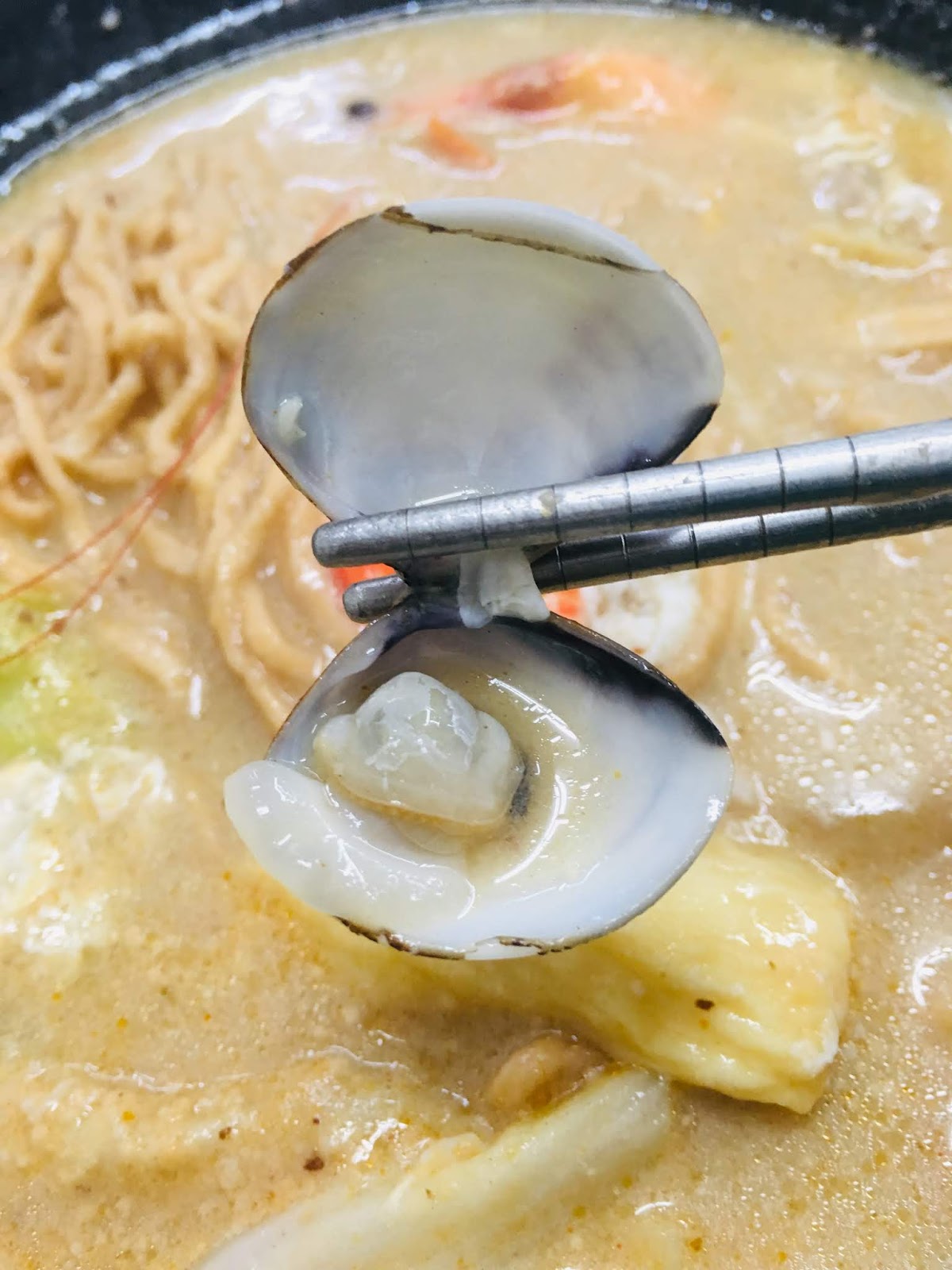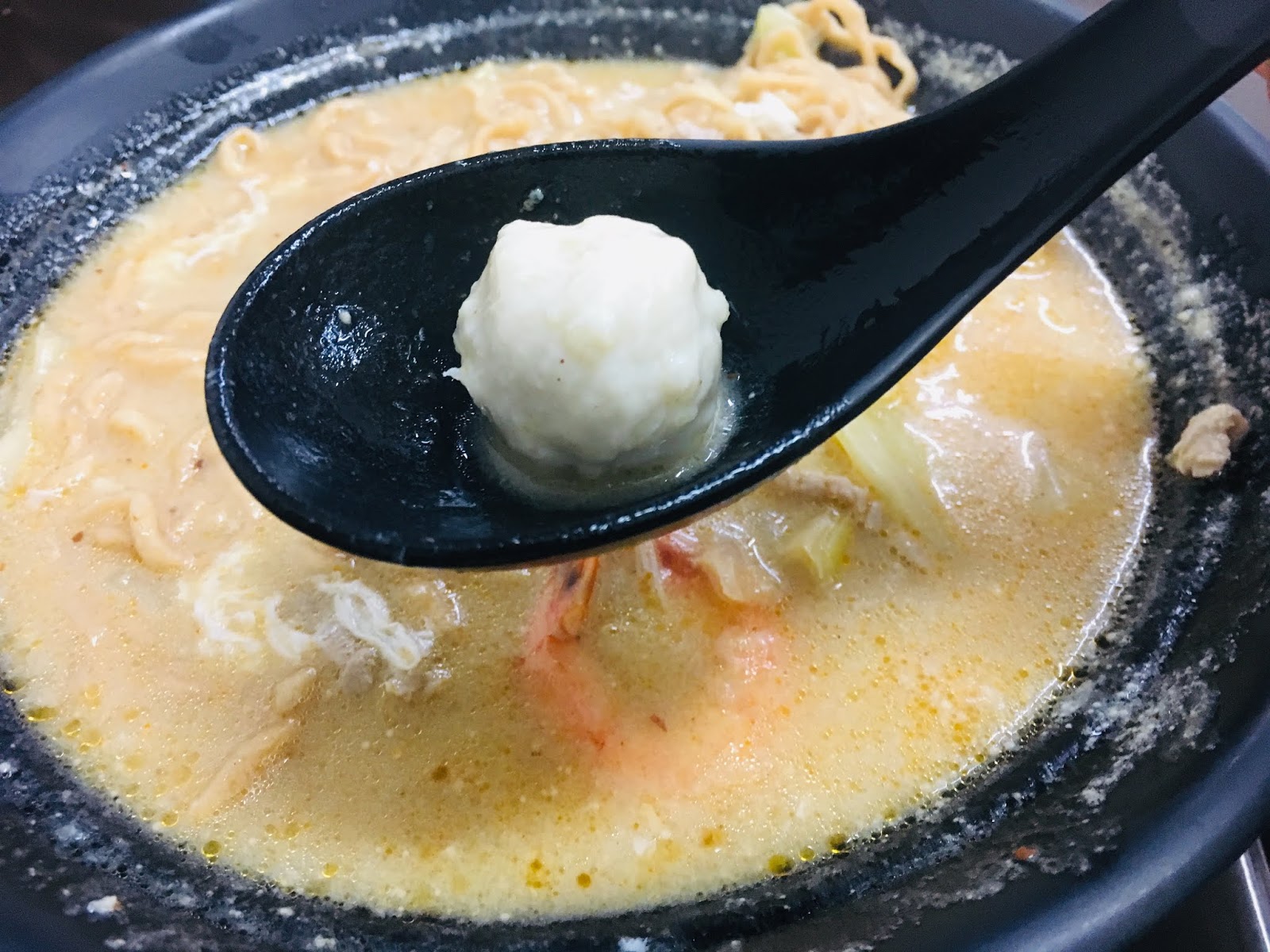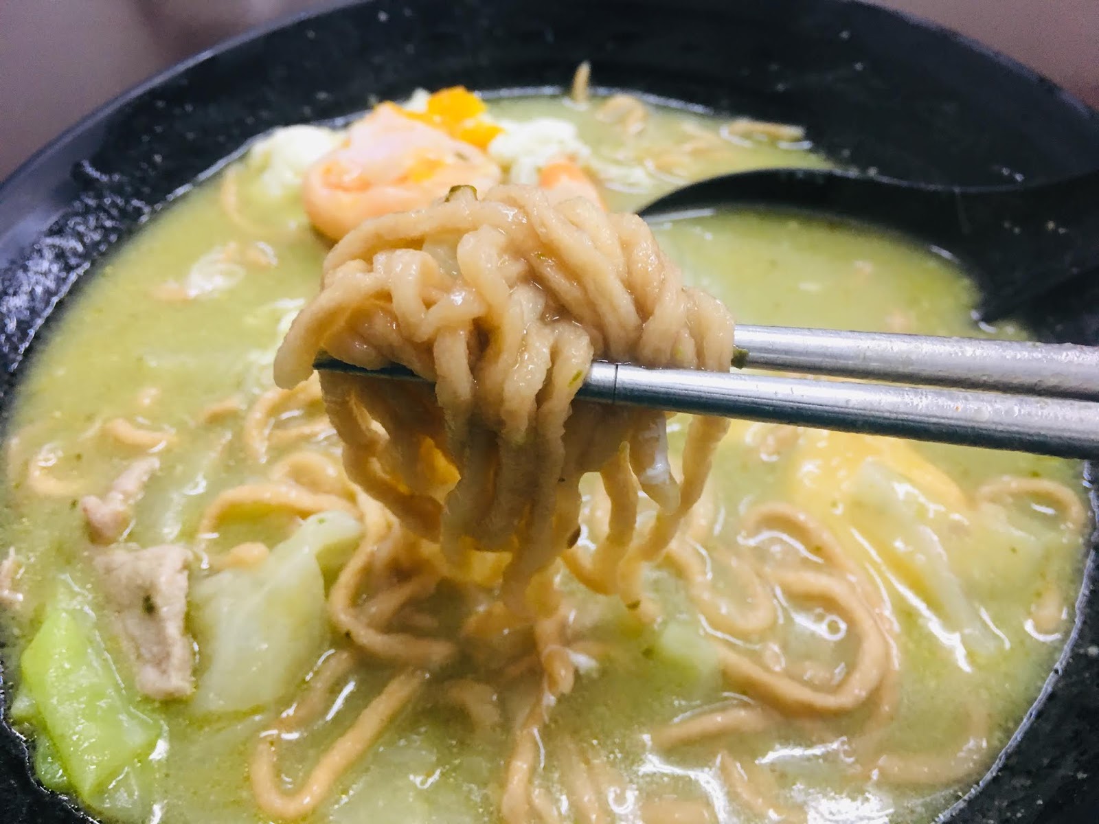 「牛奶麻辣」的湯頭,喝起來有牛奶的濃郁奶味和麻辣的椒香,意麵吸飽了香濃湯汁,配上鮮甜的蝦子和蛤蜊,扎實Q彈的貢丸、櫻花蝦卵和三角豆腐,滑嫩金黃的半熟蛋包,並以高麗菜和肉絲兼顧營養,這一大碗有著豐富配料的「牛奶麻辣鍋燒意麵」,讓人吃得好滿足呀!「牛奶」和「麻辣」的混搭湯頭,彼此互相協調不搶味,可同時吃到雙重享受,好佩服店家的創意。