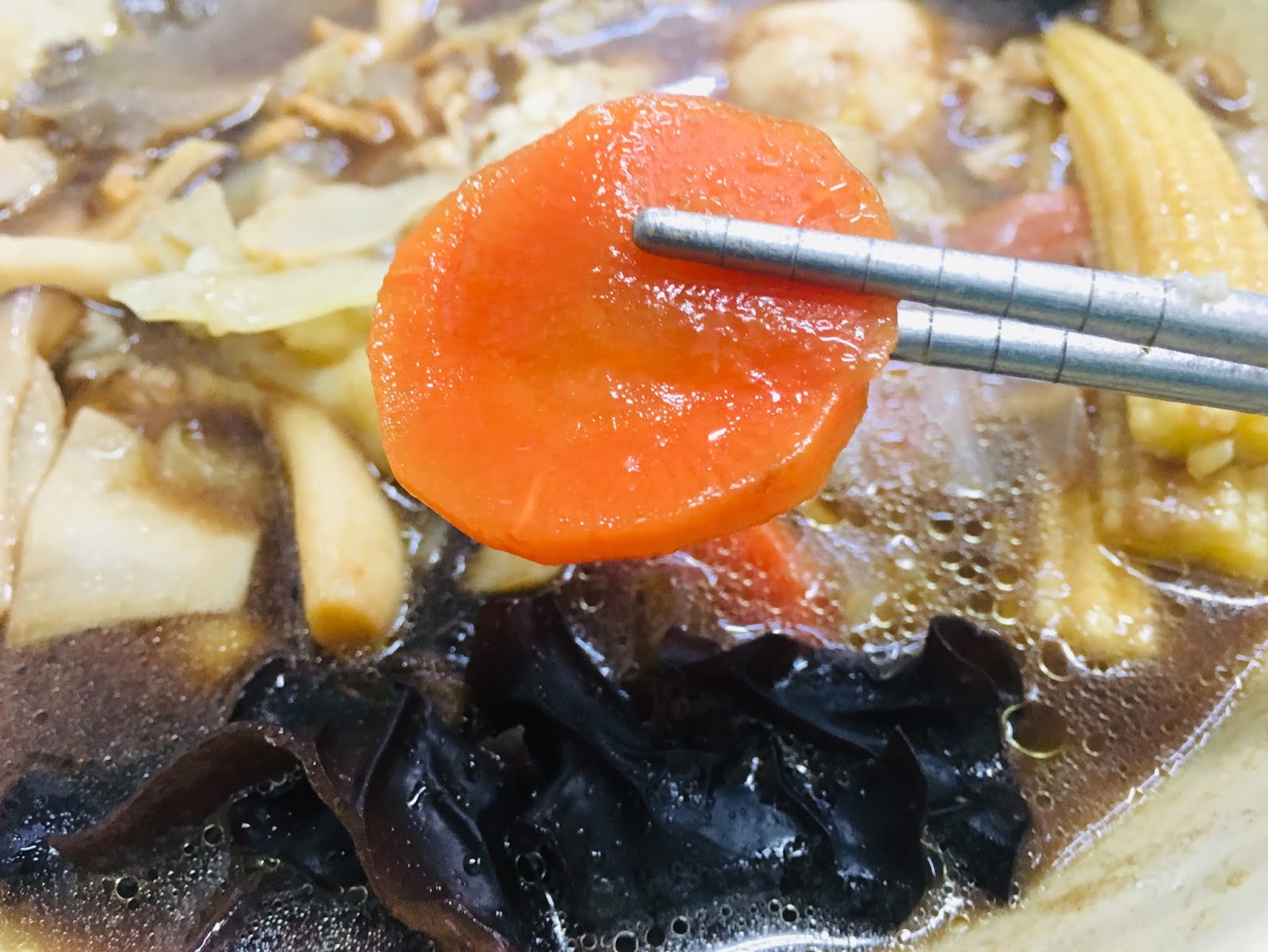 「藥膳菇菇鍋燒意麵」是以當歸、黃耆、枸杞等溫補中藥熬煮的藥膳湯頭,配料也較為養生,有各式菇類、玉米筍、紅蘿蔔、黑木耳、高麗菜,有蔬食的自然清甜,在冷冷的冬天喝著藥膳熱湯,很暖胃也暖心。