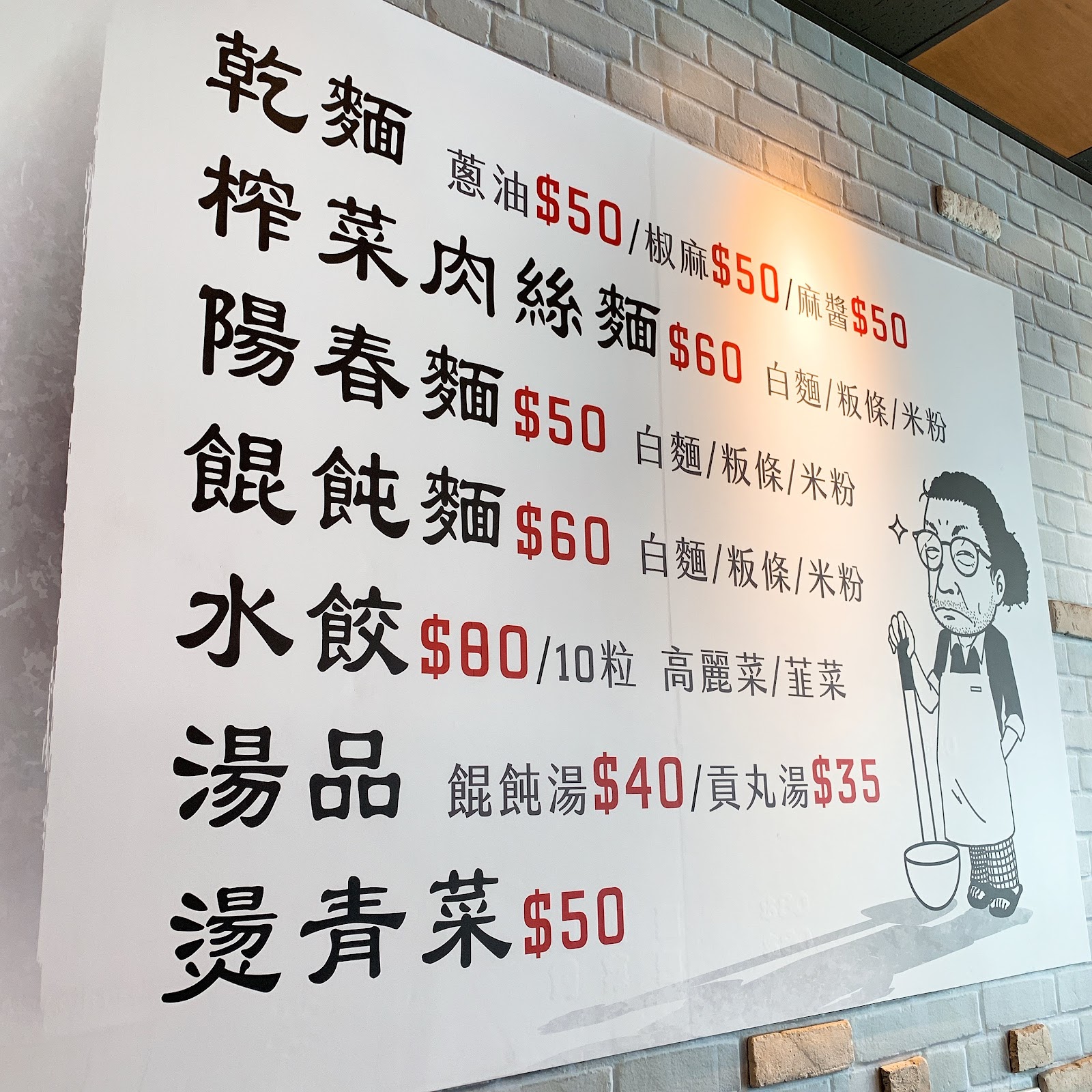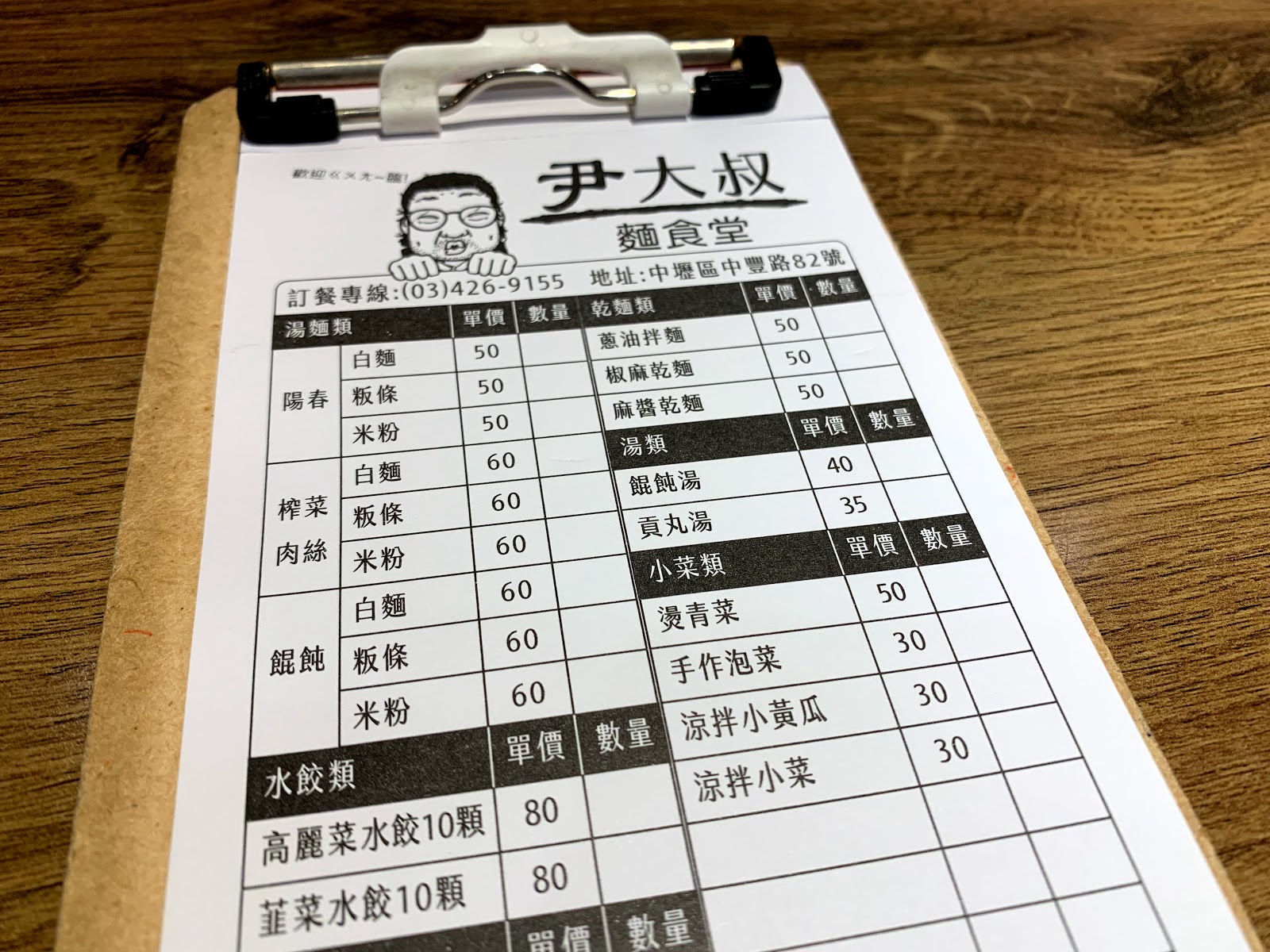 因此這家『尹大叔麵食堂』成了我們的口袋名單。鄰近中壢市區知名的興國市場,店門口有張大大的菜單,清楚寫著店家所供應的餐點,其中乾麵就有三種口味,分別為蔥油、椒麻和麻醬,還有店內與外面招牌都可以看見仿老闆的漫畫版肖像圖,豐富的臉部表情令人印象深刻。