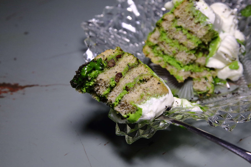 吃起來非常有彈性、鬆軟,兩層蛋糕體中間夾著抹茶醬和紅豆的驚喜,味道並不衝突,