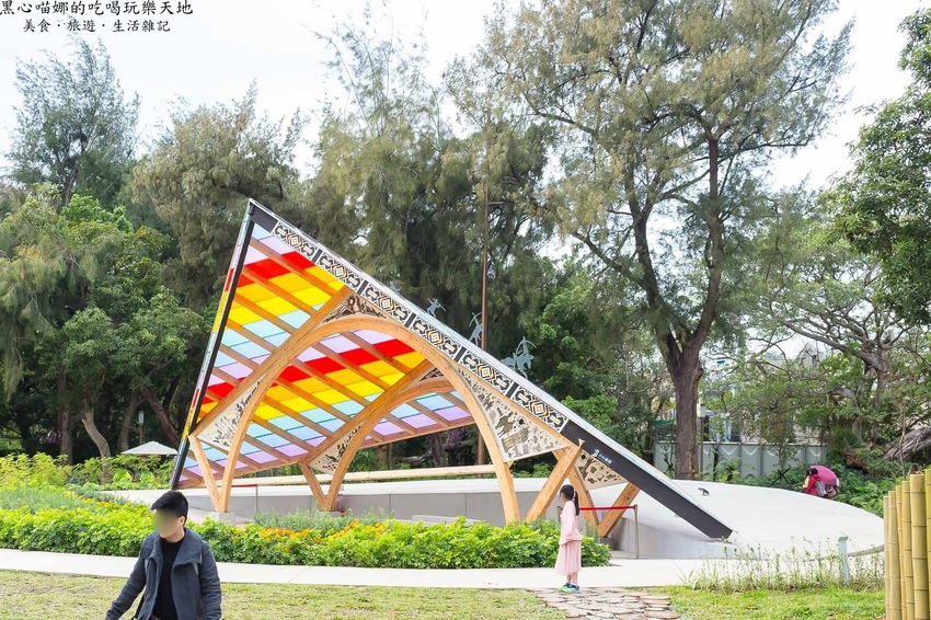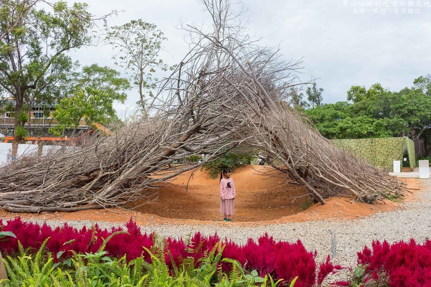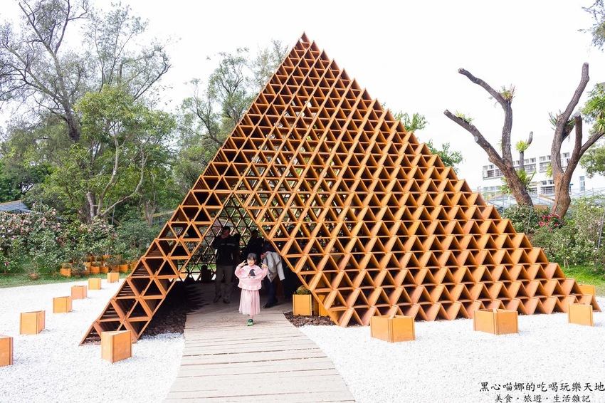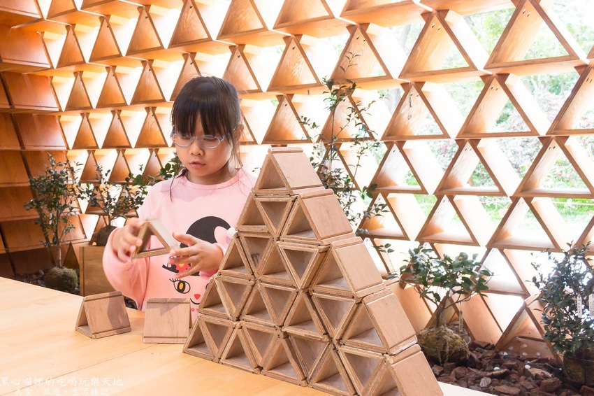 用了好多好多三角型木板所打造的金字塔,裡頭的桌上放著小巧可愛的木頭三角柱,能讓小朋友們動動腦,堆出不同形狀的積木作品喔!