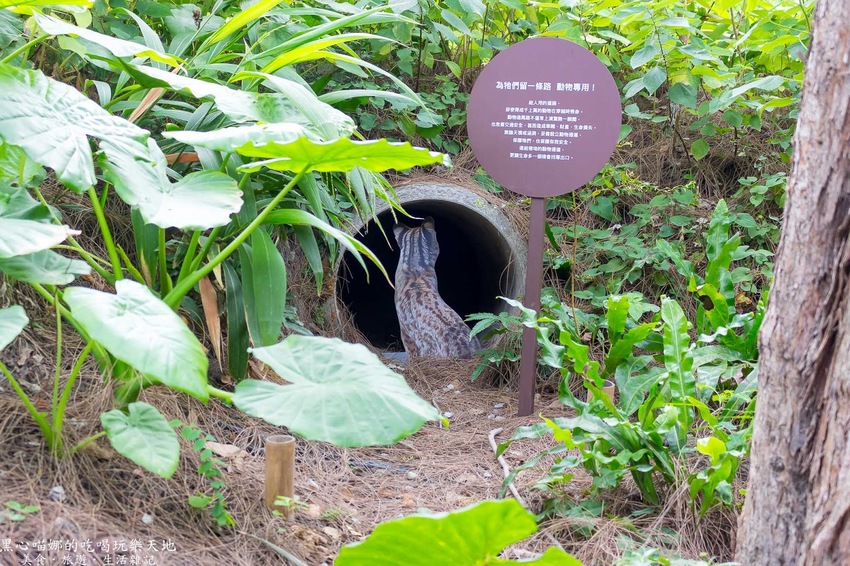 其實不是啦!只是做得很逼真的背影立牌而已,一旁寫著「給人用的道路,卻使得成千上萬的動物在穿越時喪命。動物過馬路不僅常上演驚險一瞬間,也危害交通安全,甚至造成車輛、財產、生命損失。無論天橋或涵洞,妥善設立動物通道,保護牠們、也保護你後安全。連結棲地的動物通道,讓生命多一個機會找尋出口。」