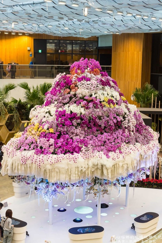 中間那垂掛玫瑰音樂花鐘,是許多花藝大師佈置而成的作品,整點時會發出悠揚樂聲,到了夜晚,燈光還會不斷變換,營造浪漫氣氛。