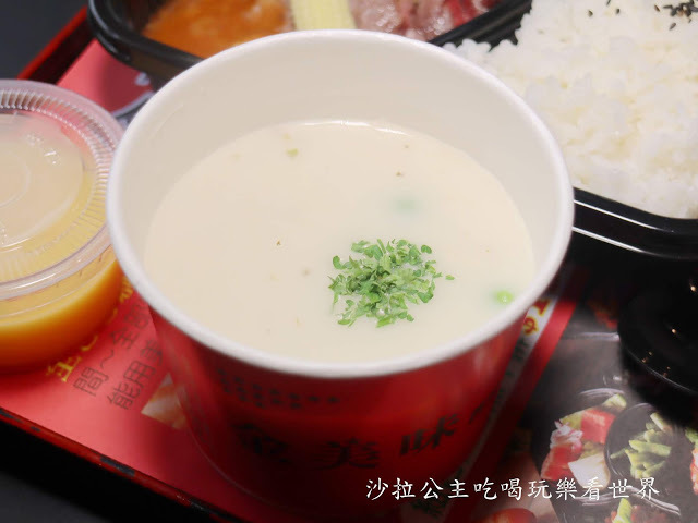上餐時會給一碗濃湯、手工甜點、一個餐盒
