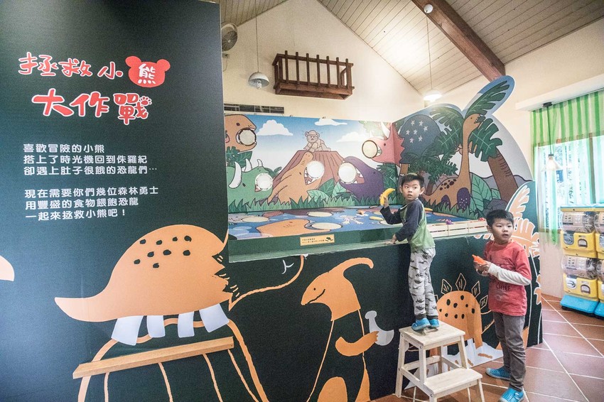 原來裡面有小遊戲可以玩呀,拯救小熊大作戰!遊戲的玩法是將食物玩具丟向恐龍嘴巴上的骨,讓恐龍吃不到小熊,看起來容易,玩起來還蠻難的,因為丟紹食物玩具,力道方向都不好控制,遠處的恐龍很難丟到...(為小熊默哀XD)