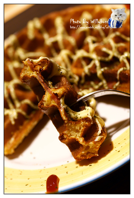 鹹的鬆餅就是在鬆餅內包入火腿和起司,其實就這麼簡單的組合,所以我說火腿和起司根本就是絕配XD,鬆餅上頭淋的鹹美乃滋和火腿起司也是同一陣線,吃起來奇搭無比,真要我說的話,其實鹹的甜的我都愛啊!