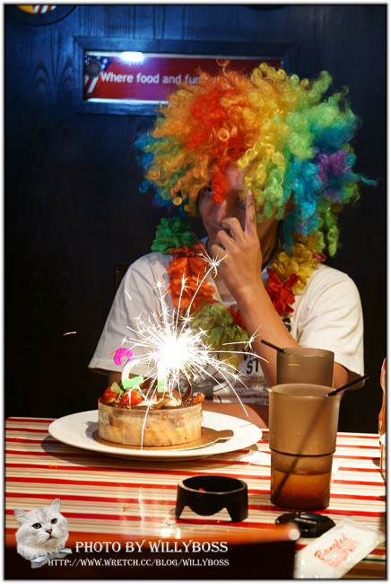 巧遇隔壁桌兩個大男生正在慶祝生日XD,牛仔特別幫壽星準備了一頂帥氣大假髮和生日蛋糕!
