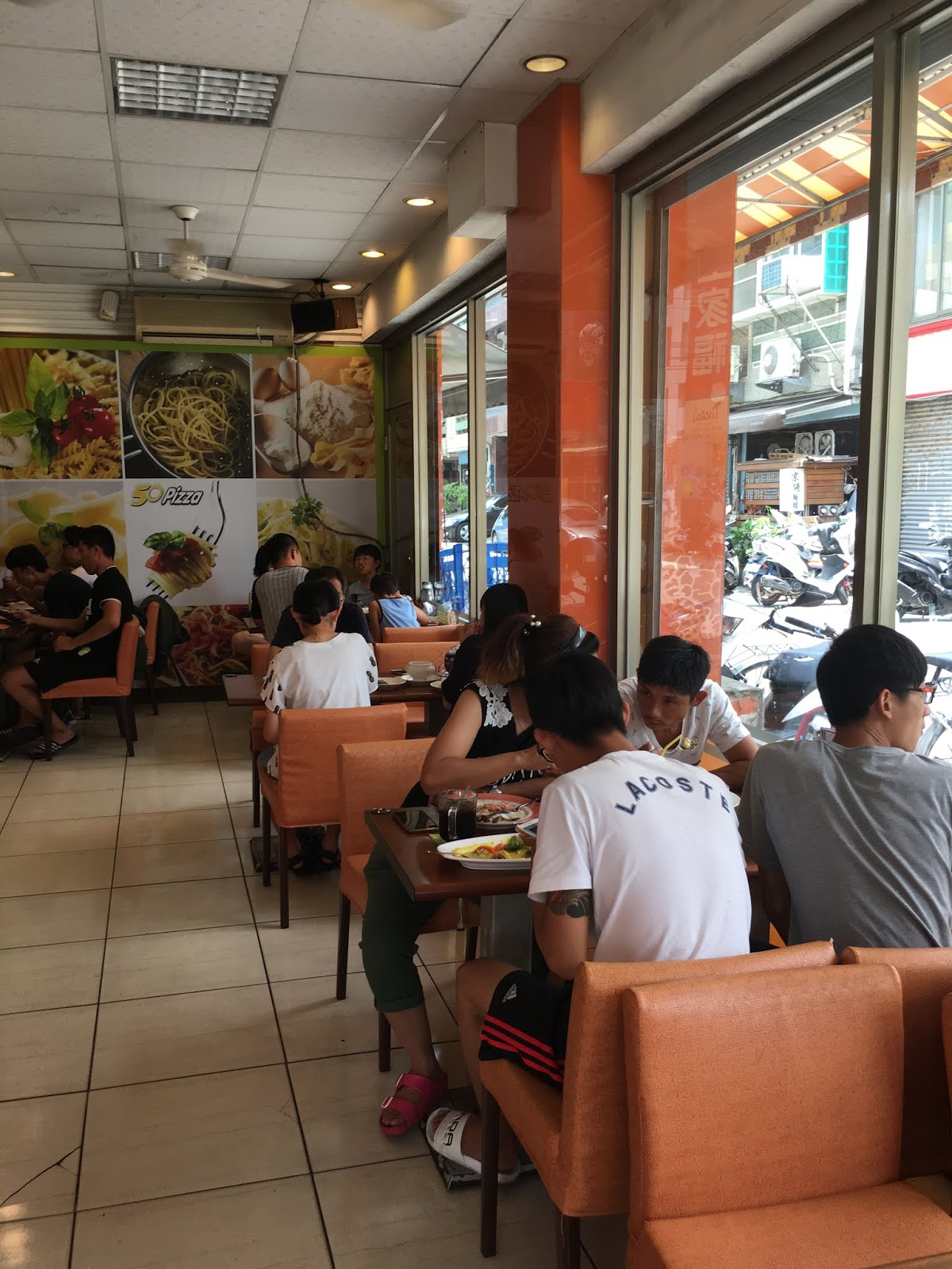 由於帶著小孩,我們盡可能避開用餐尖峰時間,選擇在週日下午一點多左右進餐廳。在中正路與白宮街的三角窗,橘黃色的50 Pizza招牌非常顯眼。