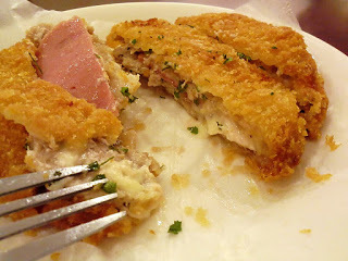 法式藍帶豬排是肉排夾上多層香濃起司與鮮美火腿,再裹上炸粉煎炸,多層次的結構香脆可口,豬排咬起來鮮嫩多汁。