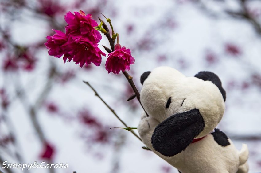 只是史努比並沒有很滿意,因為抱不到櫻花茂盛的角度,