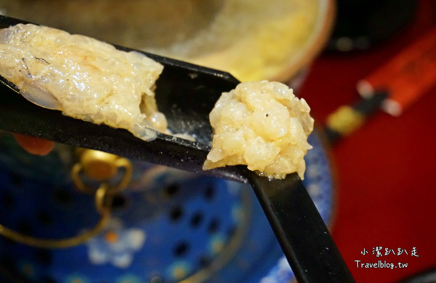 一顆顆任憑自己喜歡大小滾入酸菜白肉鍋內煮,一口咬下吸附著酸菜湯汁蝦仁球Q彈有勁,