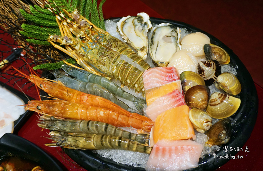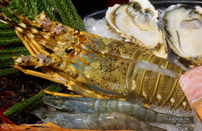 海龍王霸氣海鮮盤:小龍蝦、天使紅蝦、草蝦、白蝦、干貝、鮭魚片、鯛魚片、生蠔、蛤蠣 。