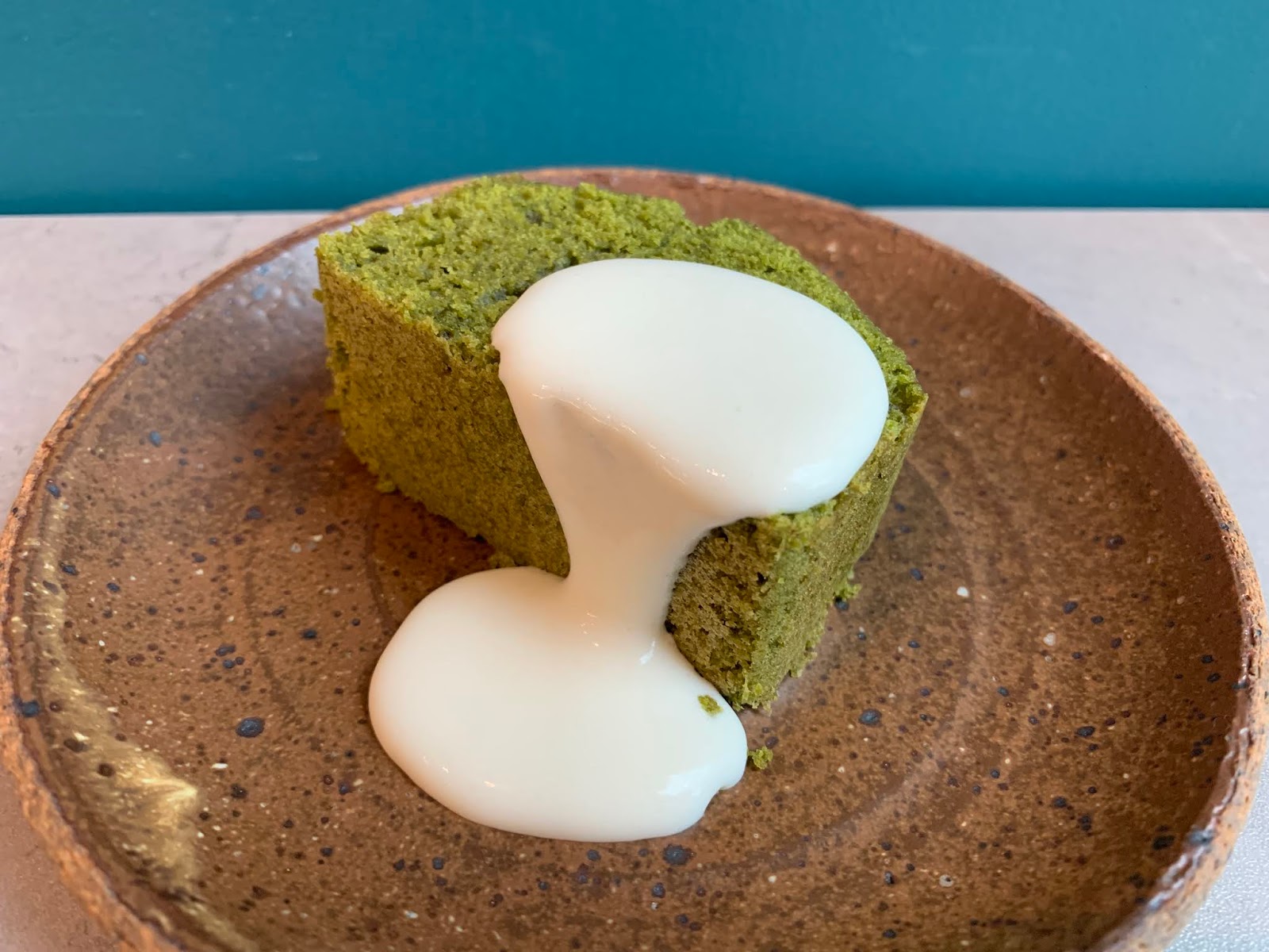 採用日本抹茶之首-丸久小山圓抹茶粉,嚐起來略帶抹茶原有苦澀味,所以比較不會有甜膩的感覺,這款磅蛋糕尚未經過冷藏,相對也鬆軟許多,淋上些許鮮奶油,不論視覺還是味覺都讓人食指大動!
