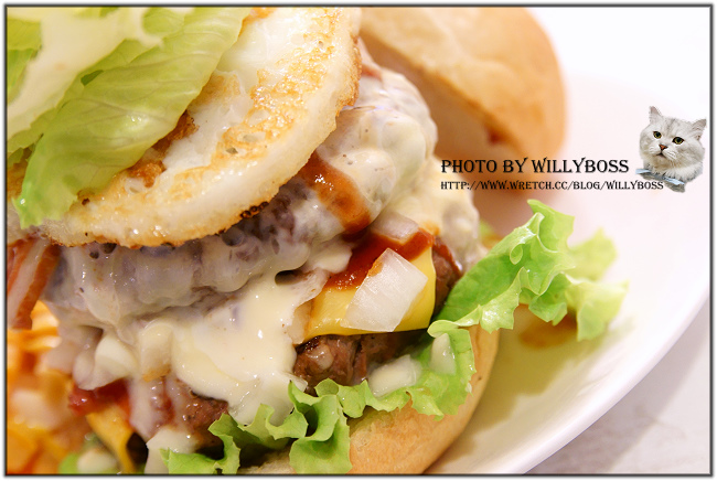 雙醬是兩種不同的起司醬,再多加上培根和一片起司,雙層指的當然是兩片牛肉漢堡肉,份量十足!蛋是因為本人愛吃特別商請老闆製作的XD。
