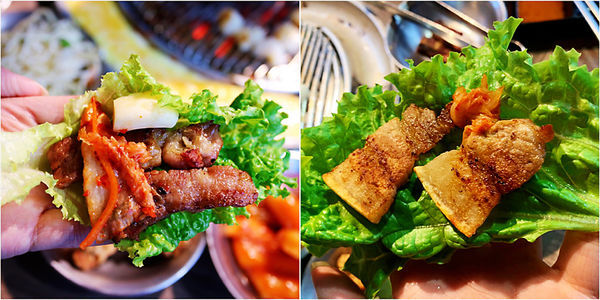 新鮮生菜包著烤好的肉,再加上喜歡的配料
