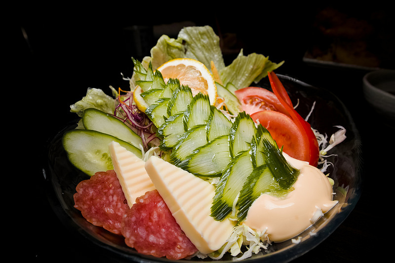 黃瓜其實已經被切成絲了, 但仍然展現像一片一片的樣子, 旁邊的是起司加上沙拉米(一種火腿)
