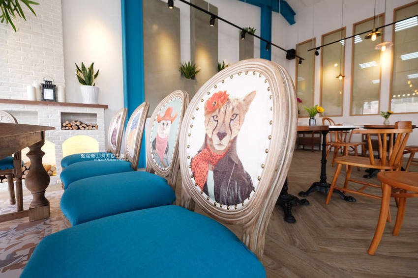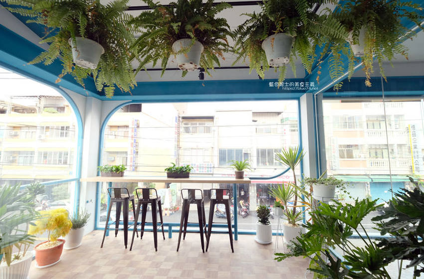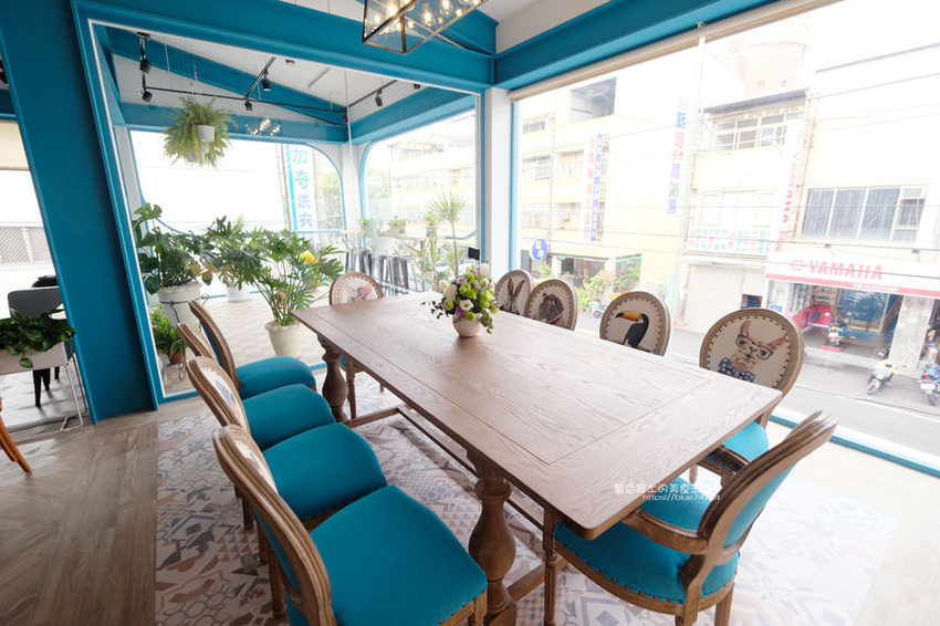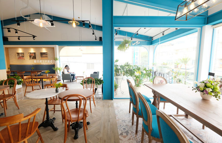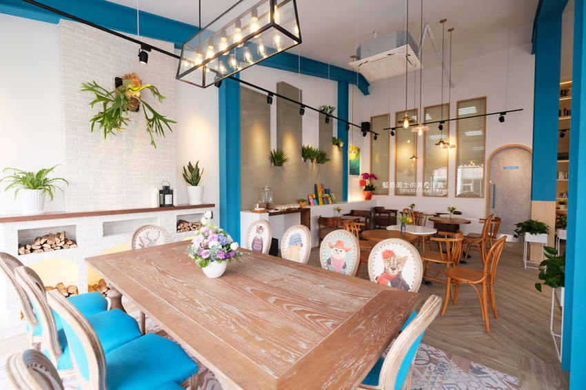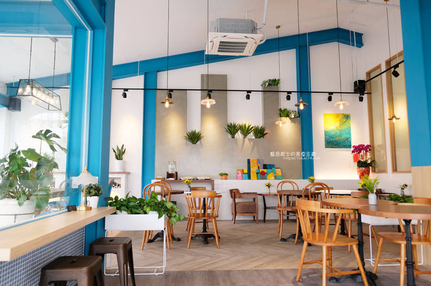 到裡面木質調的桌椅、木板地,不時穿插彩繪跟色塊的佈置跟綠意植栽