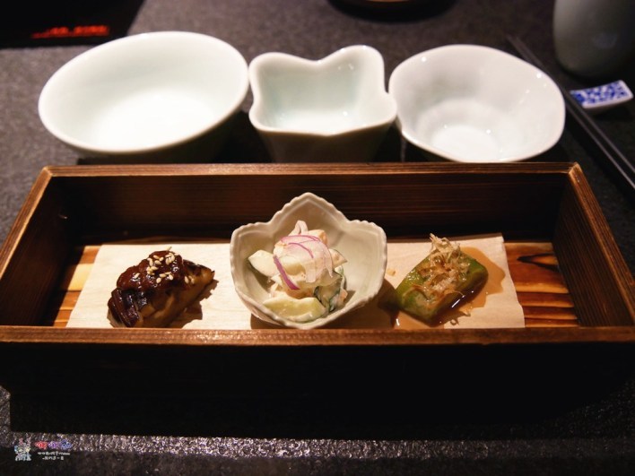先是幫我們面前神秘的小碟子倒入醬汁,最右邊是蘋果醋,味道不會太酸或太嗆,很溫和。然後後面是醬油,還有其他自己添加的調味佐料。