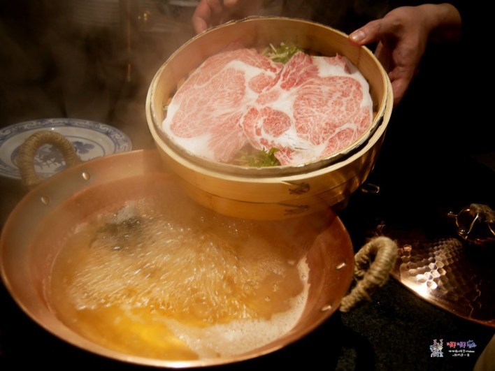 沒幾秒我們的和牛就蒸好了,第一次吃的話肯定會被這個畫面感動,太漂亮了。
