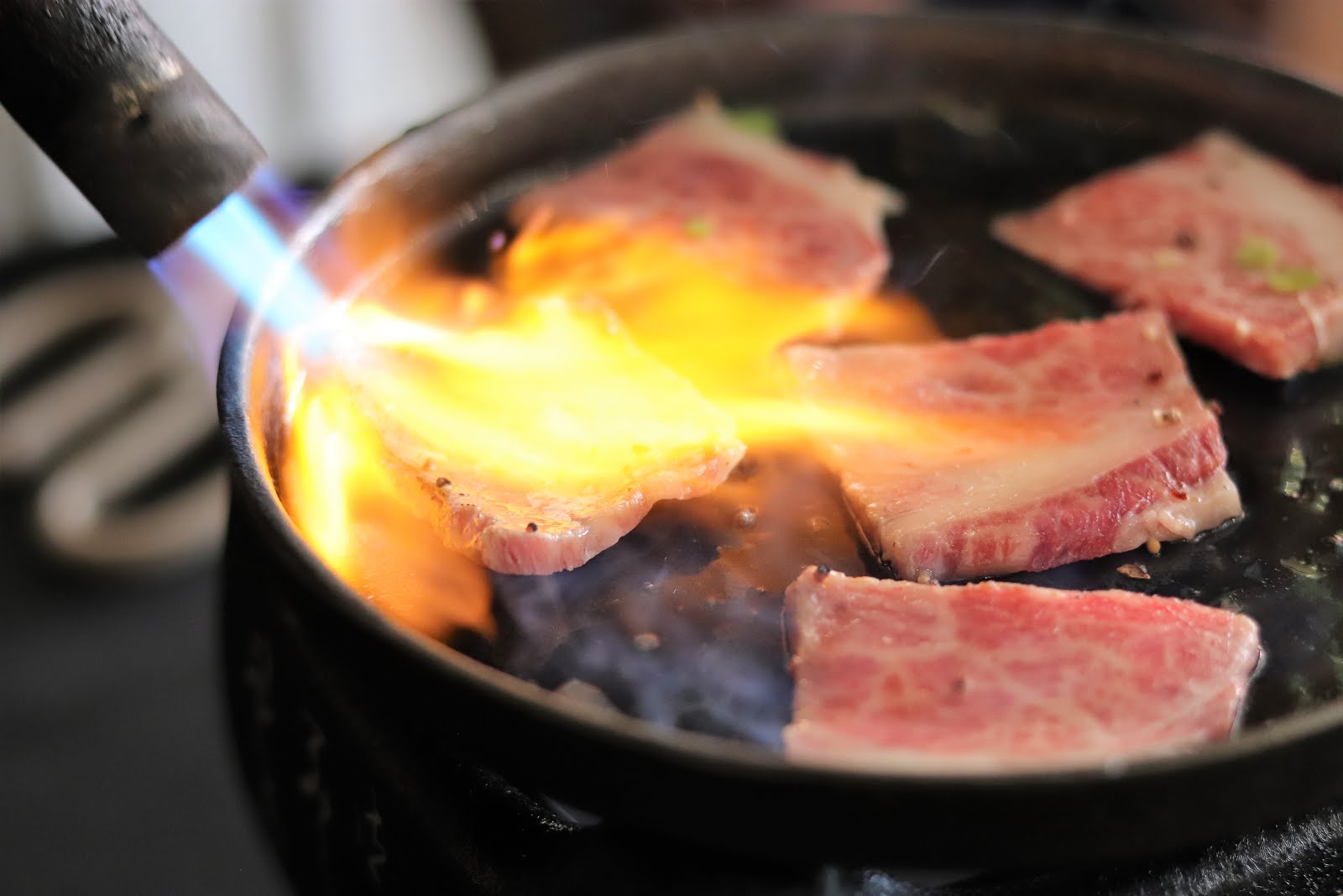 用噴槍炙燒到牛肉的邊邊呈現微微的蜷曲帶點焦,增加香氣。也因為使用這個方式將一些牛油逼出來,讓牛肉吃起來不會太油膩又能讓表面看起來油亮油亮的。