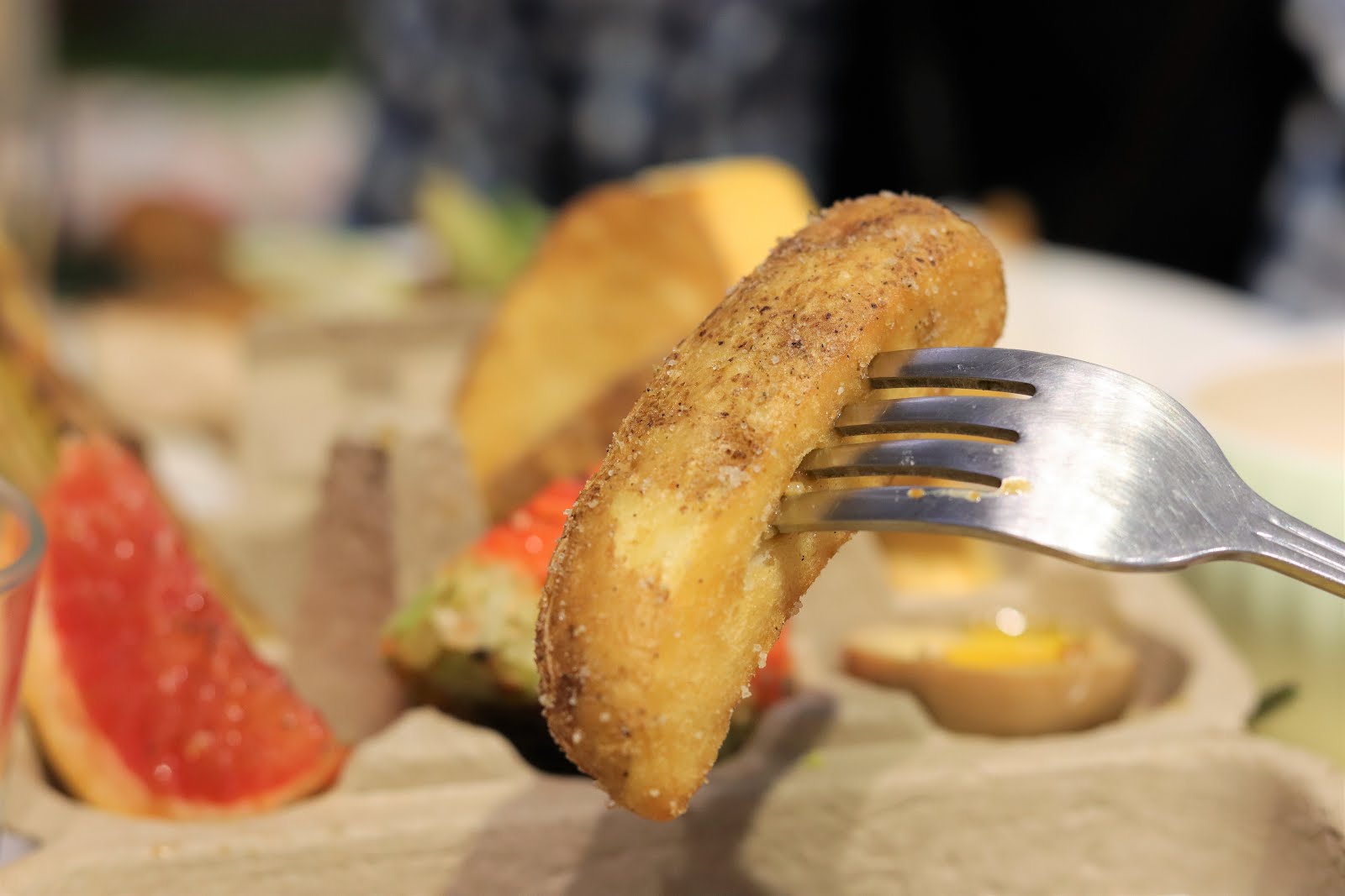 大家都知道葡萄柚吃起來多少會帶點苦澀,但是他們在葡萄柚的表層烤了焦糖將它包裹住,所以在吃的時候焦糖的香甜會中和掉苦澀感,也讓葡萄柚多了特出的口感。有種好想把所有橙類的水果都拿來試試這種吃法,感覺很不錯。