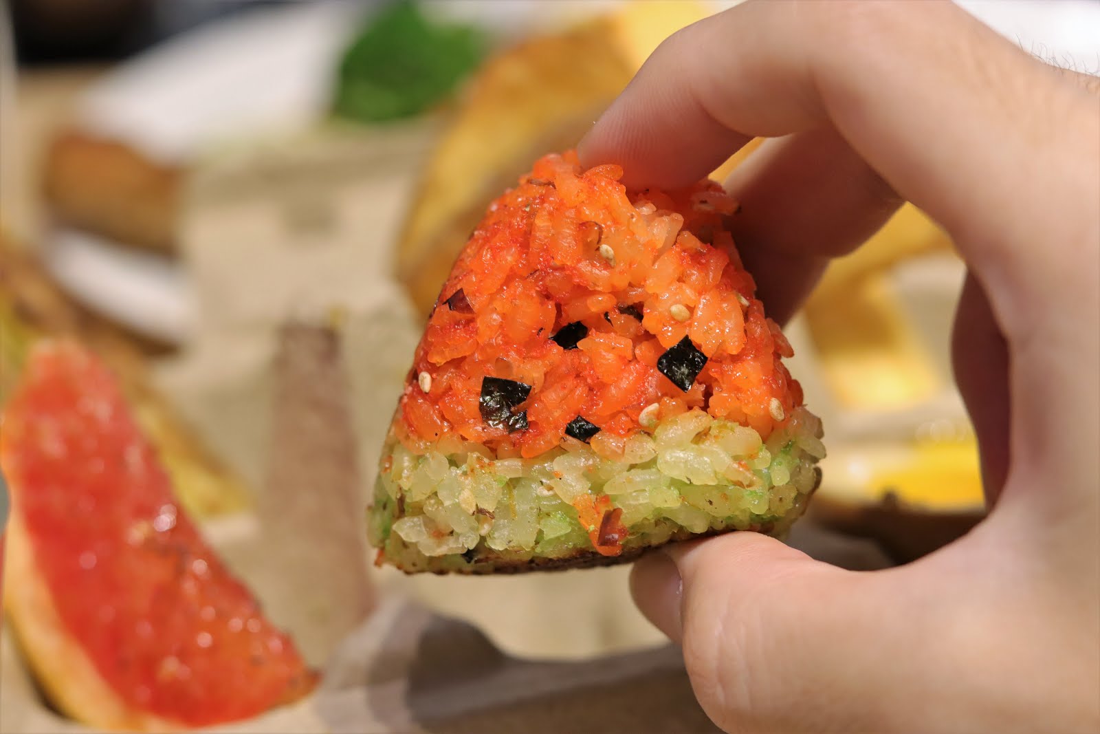 造型可愛餐點一上來眼睛就會先被這給吸引的西瓜烤飯糰,表層烤的微焦很香,裏頭還包著應該是明太子的內餡,用海苔當作是西瓜籽,我只能說太用心了吧~這一定要拍照紀念一下,最好是拿到臉頰旁和它自拍一張。